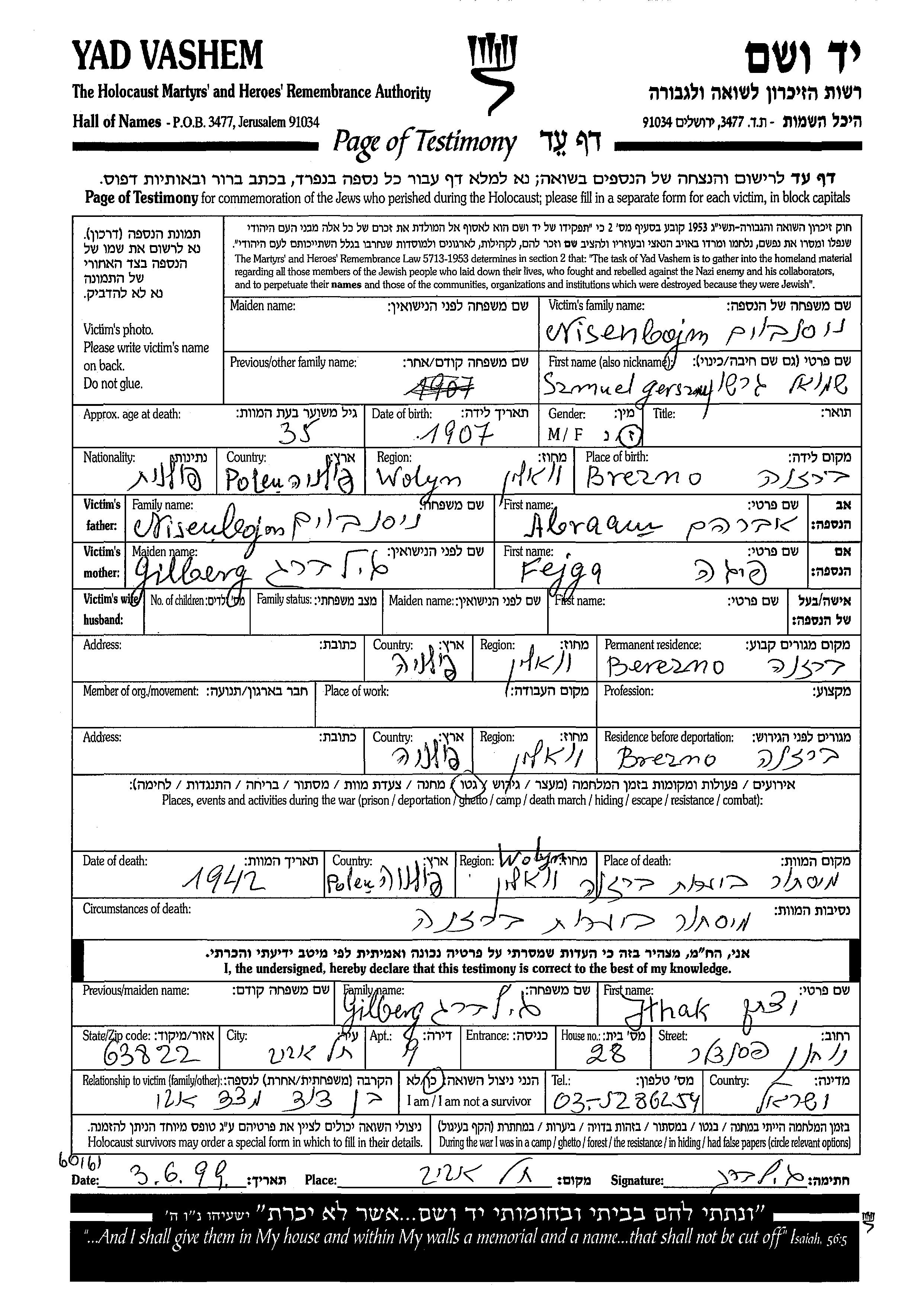 Nisenbojm Szmuel Gerszon 1907 Brezne, Polen Gedenkblatt