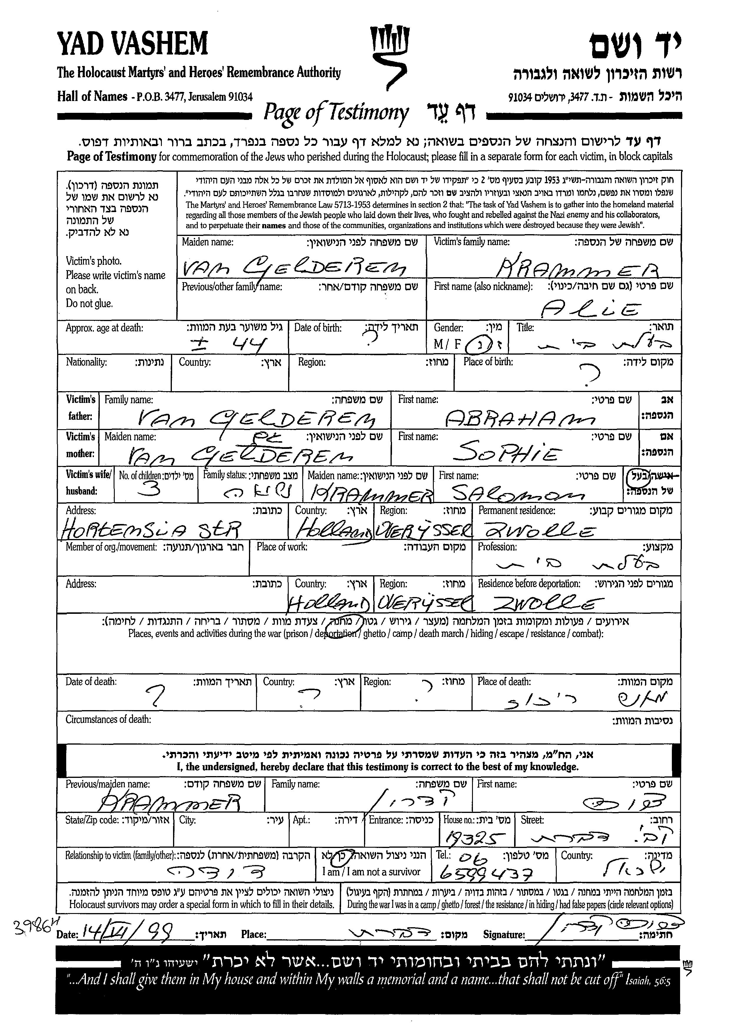 Alie Krammer, geb. van Gelderen wurde Sie war die Tochter von Abraham und Sophie. Sie war Hausfrau und mit Salomon Verheiratet. Vor dem Zweiten Weltkrieg lebte sie in Zwolle, Niederlande. Während des Krieges war sie in Zwolle, Niederlande.