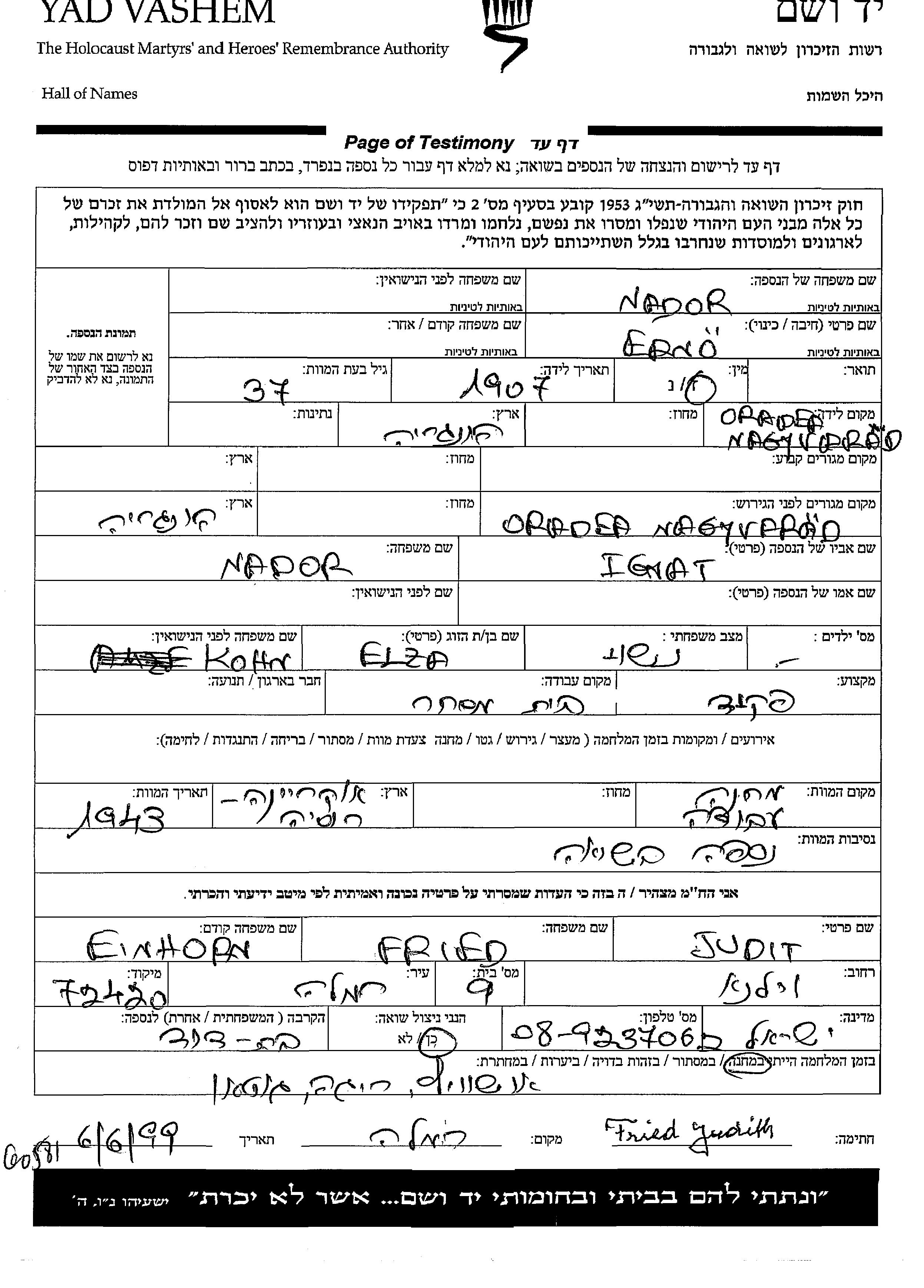Erno Nador wurde im Jahr 1907 in Oradea, Rumänien geboren. Er war der Sohn von Ignat. Er war Angestellte/-r und mit Elza, geb. Kohn Verheiratet. Während des Krieges war er in Oradea, Rumänien.