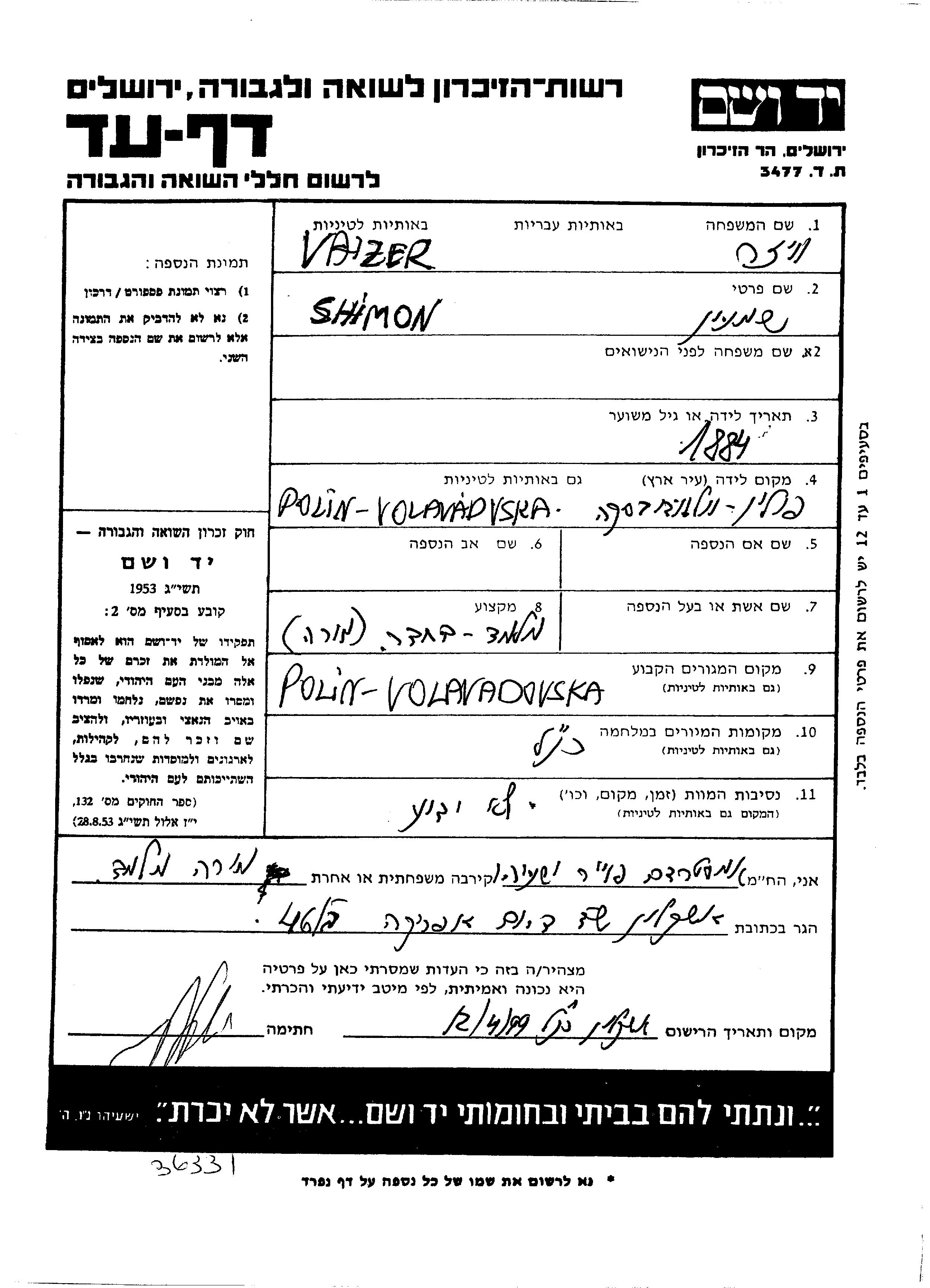 Shimon Vaizer wurde im Jahr 1884 in Wola Wadowska, Polen geboren. Er war Religious elementary school teacher. Vor dem Zweiten Weltkrieg lebte er in Wola Wadowska, Polen. Während des Krieges war er in Wola Wadowska, Polen.