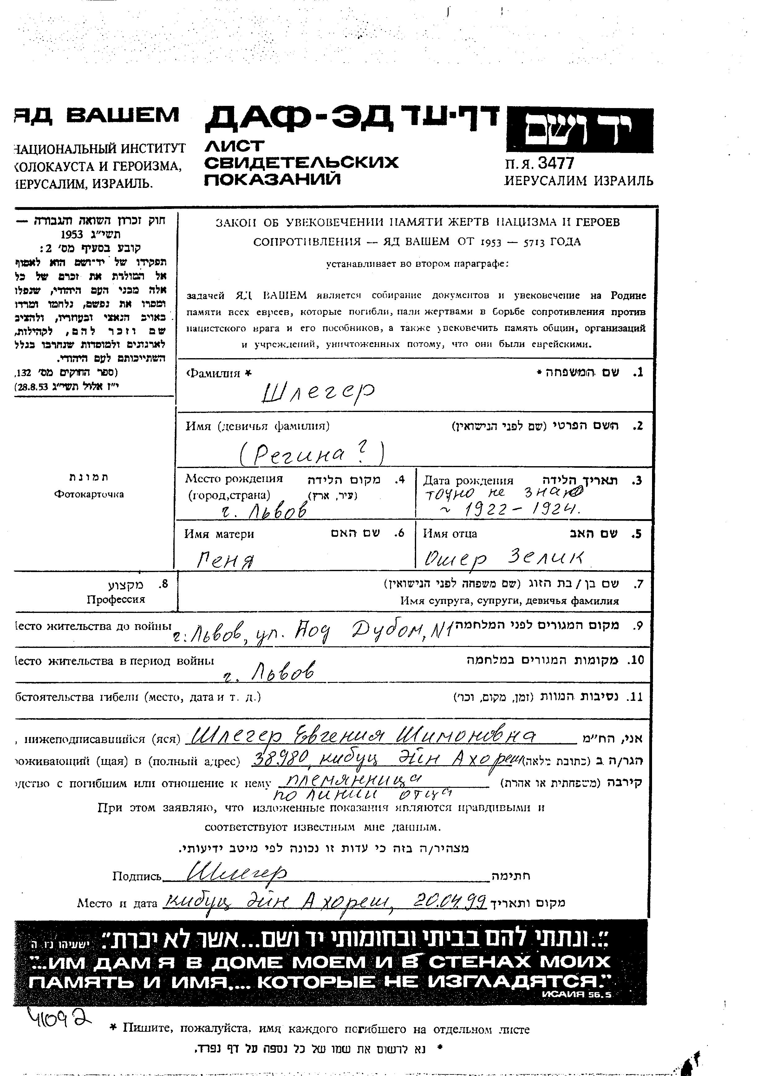 Regina Shleger wurde im Jahr 1923 in Lvov, Polen geboren. Sie war die Tochter von Osher Zelig und Genya. Vor dem Zweiten Weltkrieg lebte sie in Lvov, Polen. Während des Krieges war sie in Lvov, Polen.