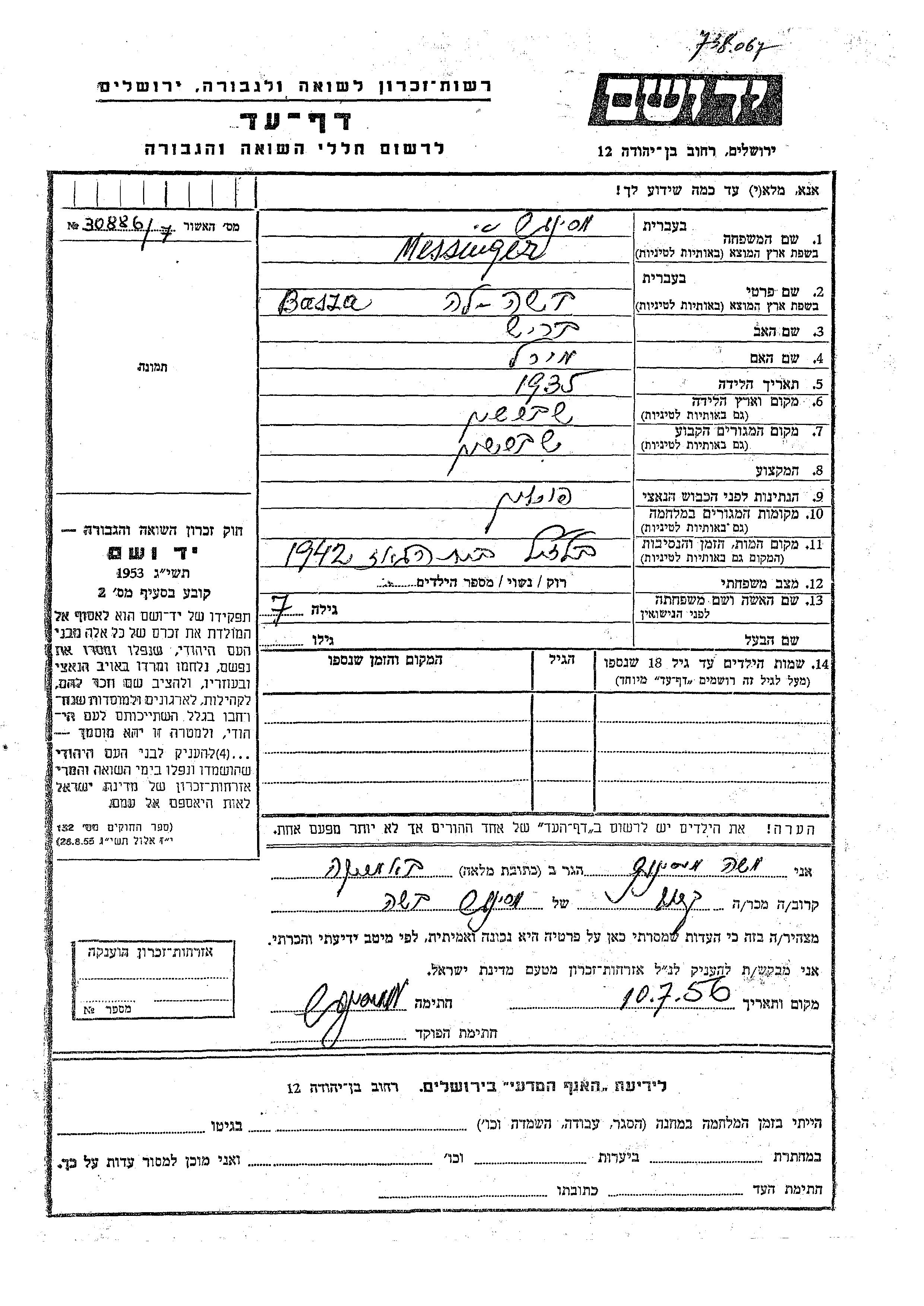 Basza Messinger wurde im Jahr 1935 in Sabinow, Polen geboren. Sie war die Tochter von Berish und Mirl. Vor dem Zweiten Weltkrieg lebte sie in Szczebrzeszyn, Polen.
