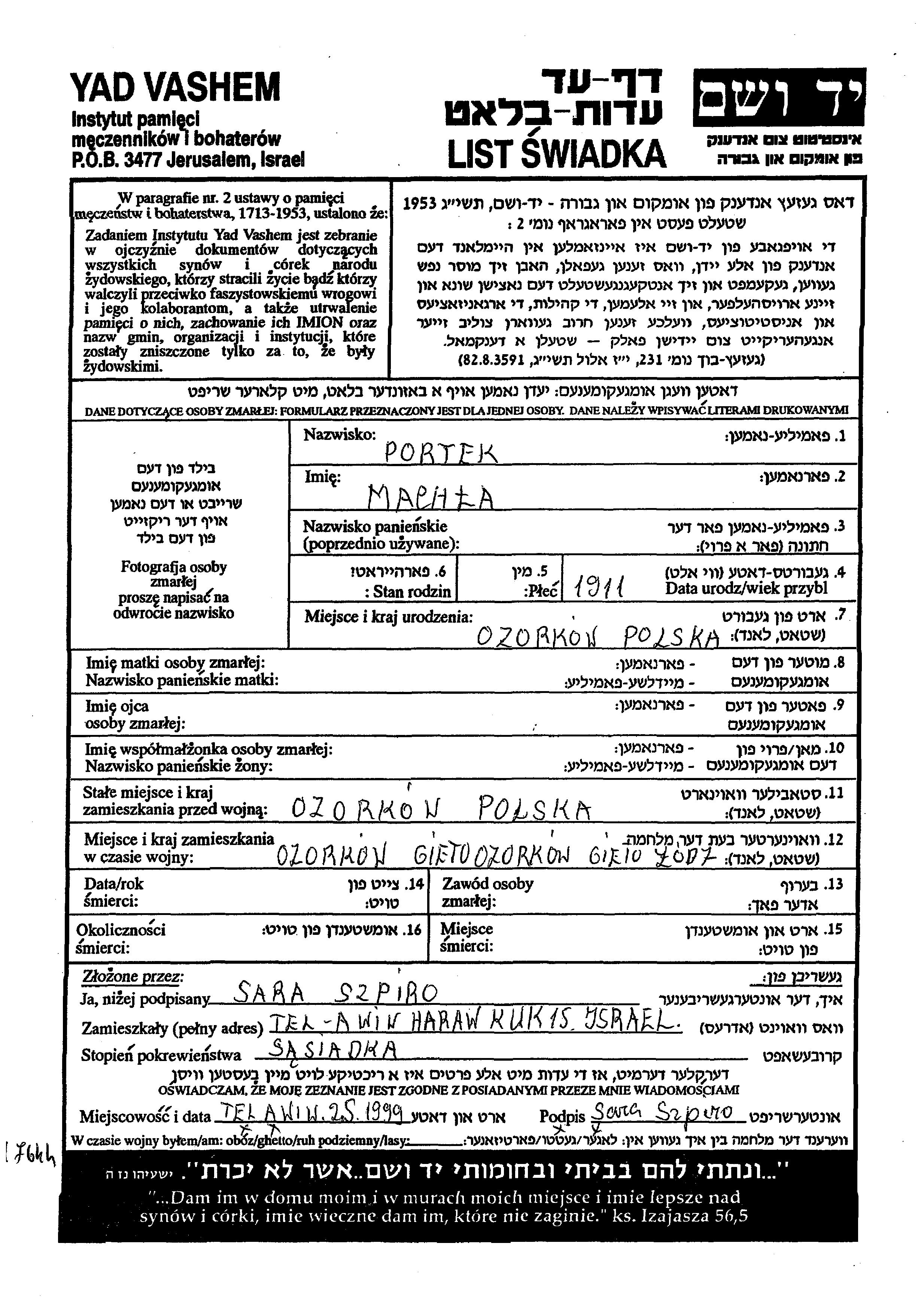 Machla Portek wurde im Jahr 1911 in Ozorkow, Polen geboren. Vor dem Zweiten Weltkrieg lebte sie in Ozorkow, Polen. Während des Krieges war sie in Ozorkow, Polen.
