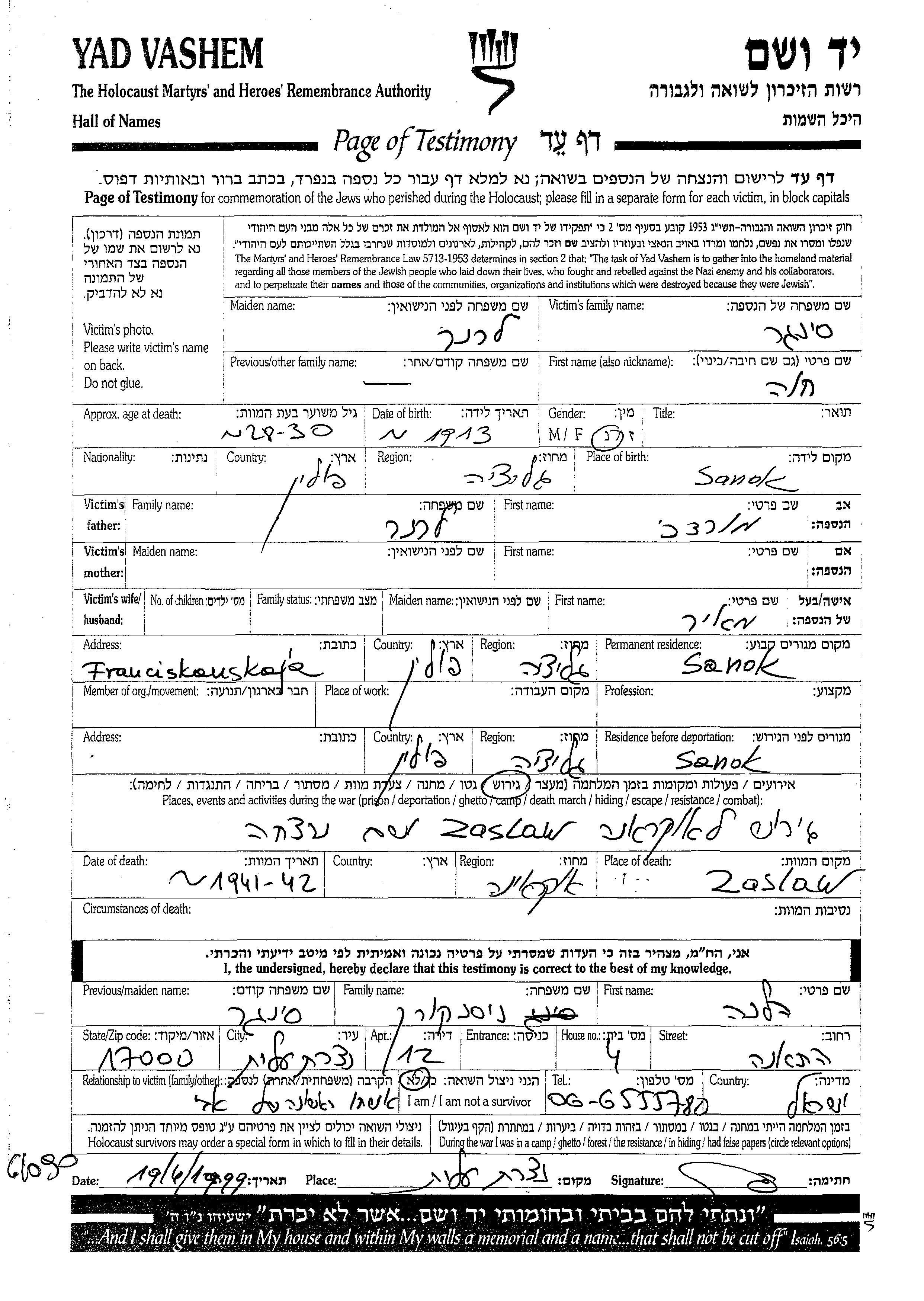 Khava Zinger, geb. Lerner wurde im Jahr 1913 in Sanok, Polen geboren. Sie war die Tochter von Mordechai. Sie war mit Meir Verheiratet. Vor dem Zweiten Weltkrieg lebte sie in Sanok, Polen. Während des Krieges war sie in Sanok, Polen.