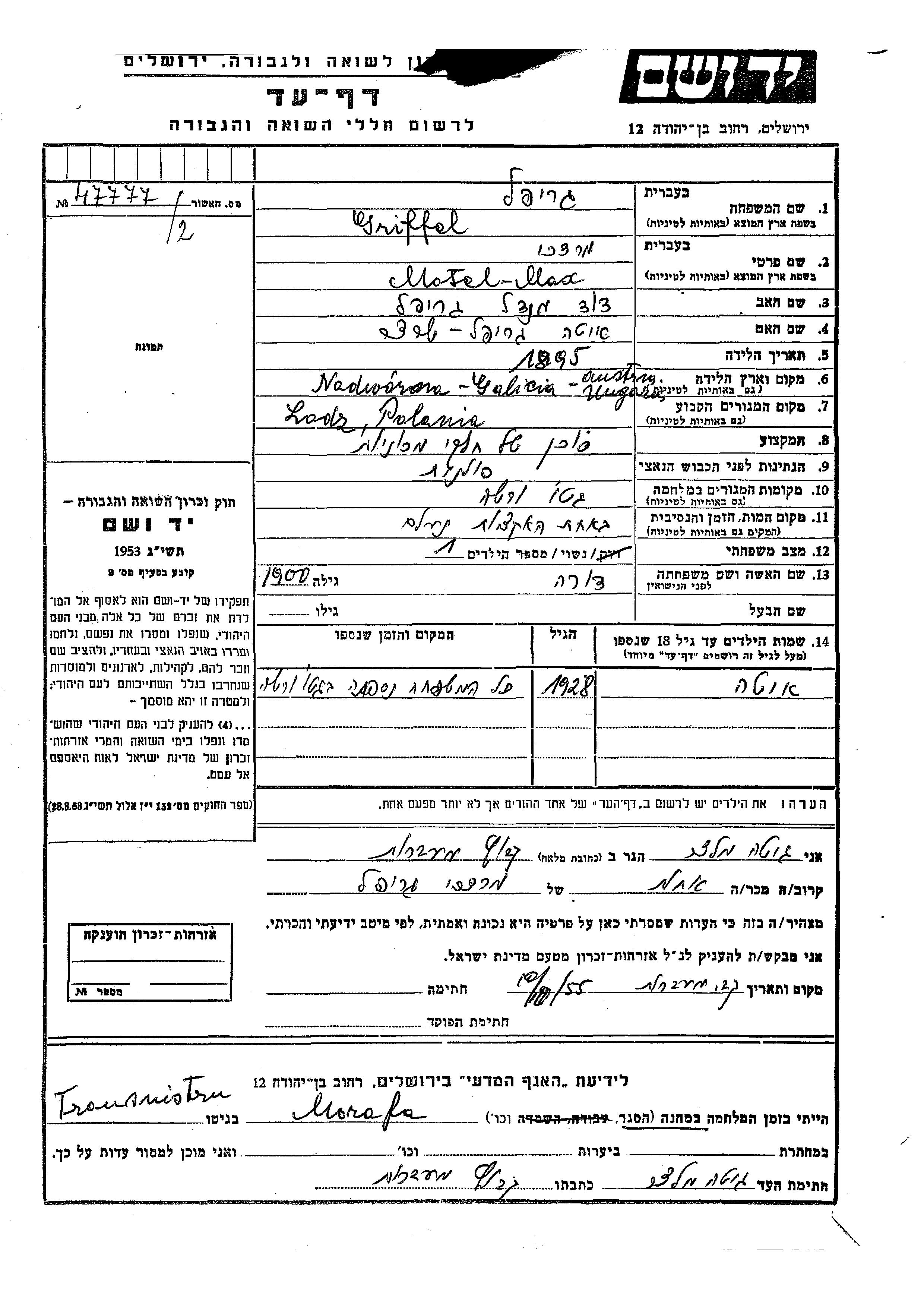 Motel Max Mordekhai Griffel wurde im Jahr 1895 in Nadvorna, Polen geboren. Er war der Sohn von David Mendel und Ita. Er war Vertreter/-in und mit Dora Verheiratet. Vor dem Zweiten Weltkrieg lebte er in Lodz, Polen. Während des Krieges war er in Warszawa, Polen.