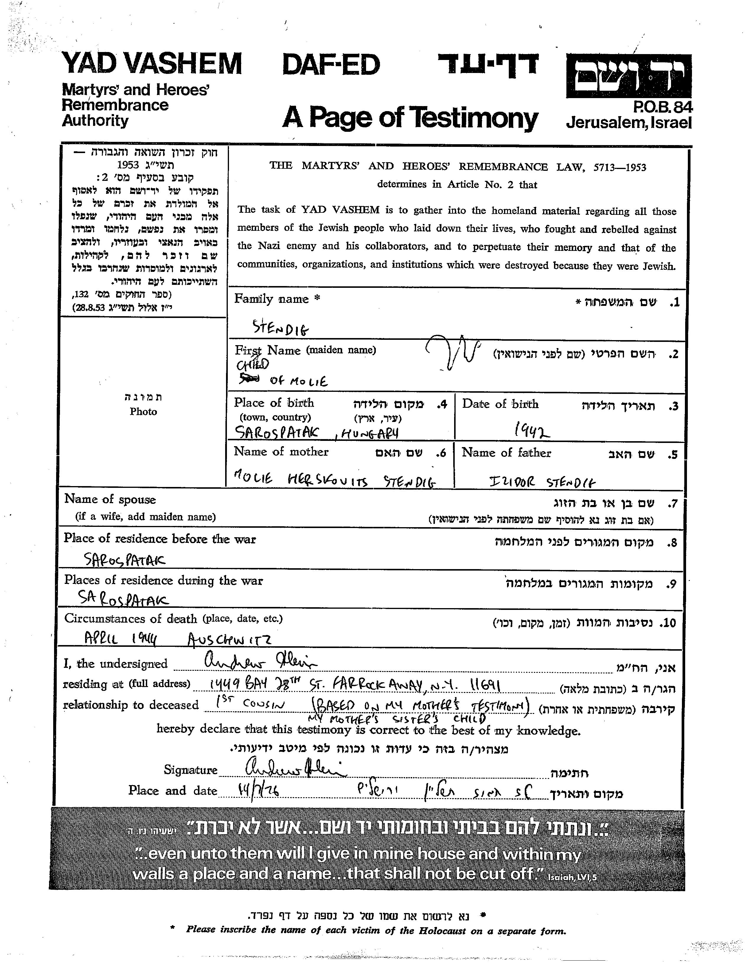 Vorname unbekannt Stendig wurde im Jahr 1942 in Sarospatak, Ungarn geboren. Sie war die Tochter von Izidor und Molie. Vor dem Zweiten Weltkrieg lebte sie in Sarospatak, Ungarn. Während des Krieges war sie in Sarospatak, Ungarn.