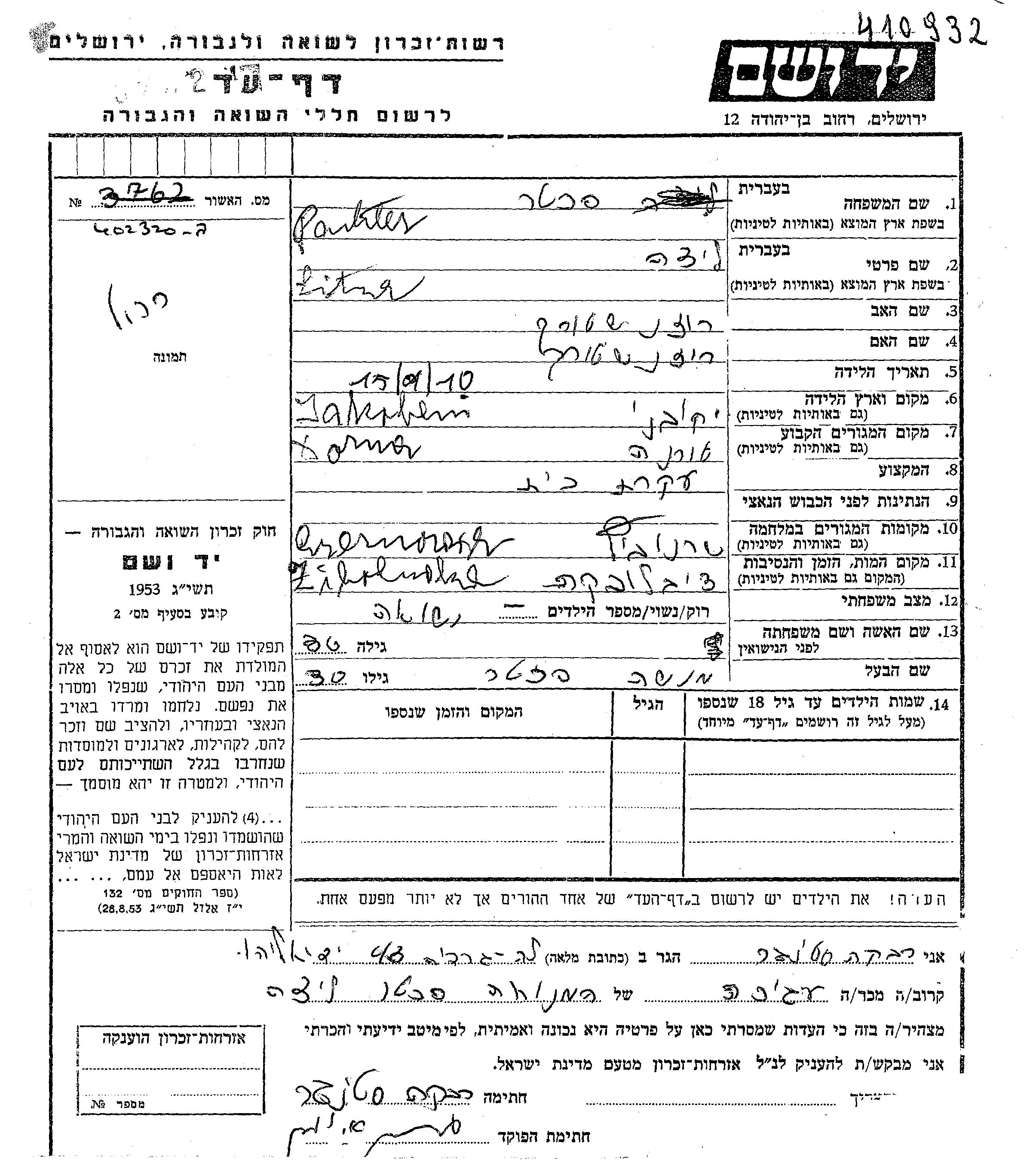 Litza Pakter Pakhter, geb. Rozenshtraukh wurde im Jahr 1910 in Jakubany, Tschechoslowakei geboren. Sie war Hausfrau und mit Menashe Verheiratet. Vor dem Zweiten Weltkrieg lebte sie in Dorna, Rumänien. Während des Krieges war sie in Cernauti, Rumänien.