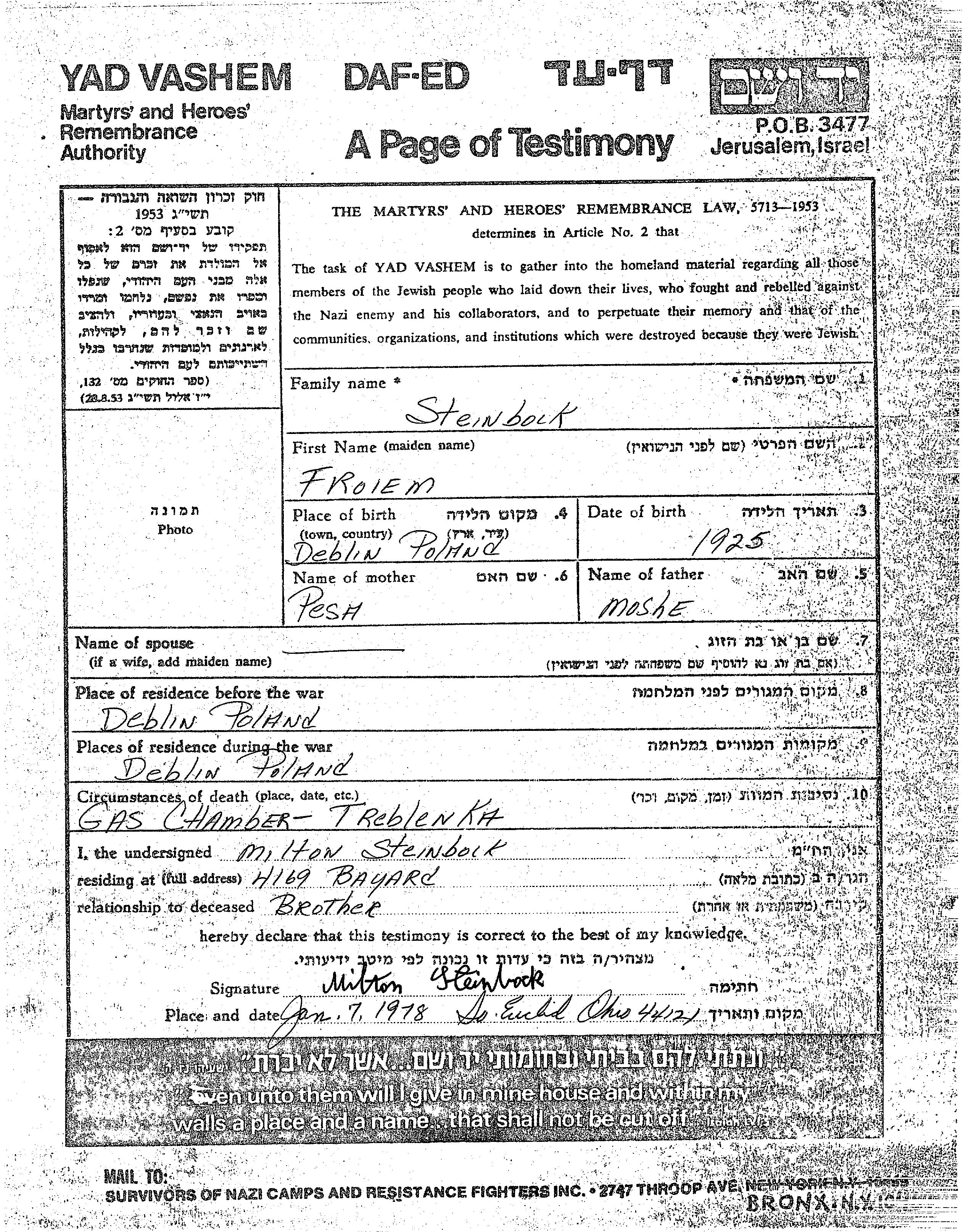 Froiem Steinbock wurde im Jahr 1925 in Deblin, Polen geboren. Er war der Sohn von Moshe und Pesa. Vor dem Zweiten Weltkrieg lebte er in Deblin, Polen. Während des Krieges war er in Deblin, Polen.