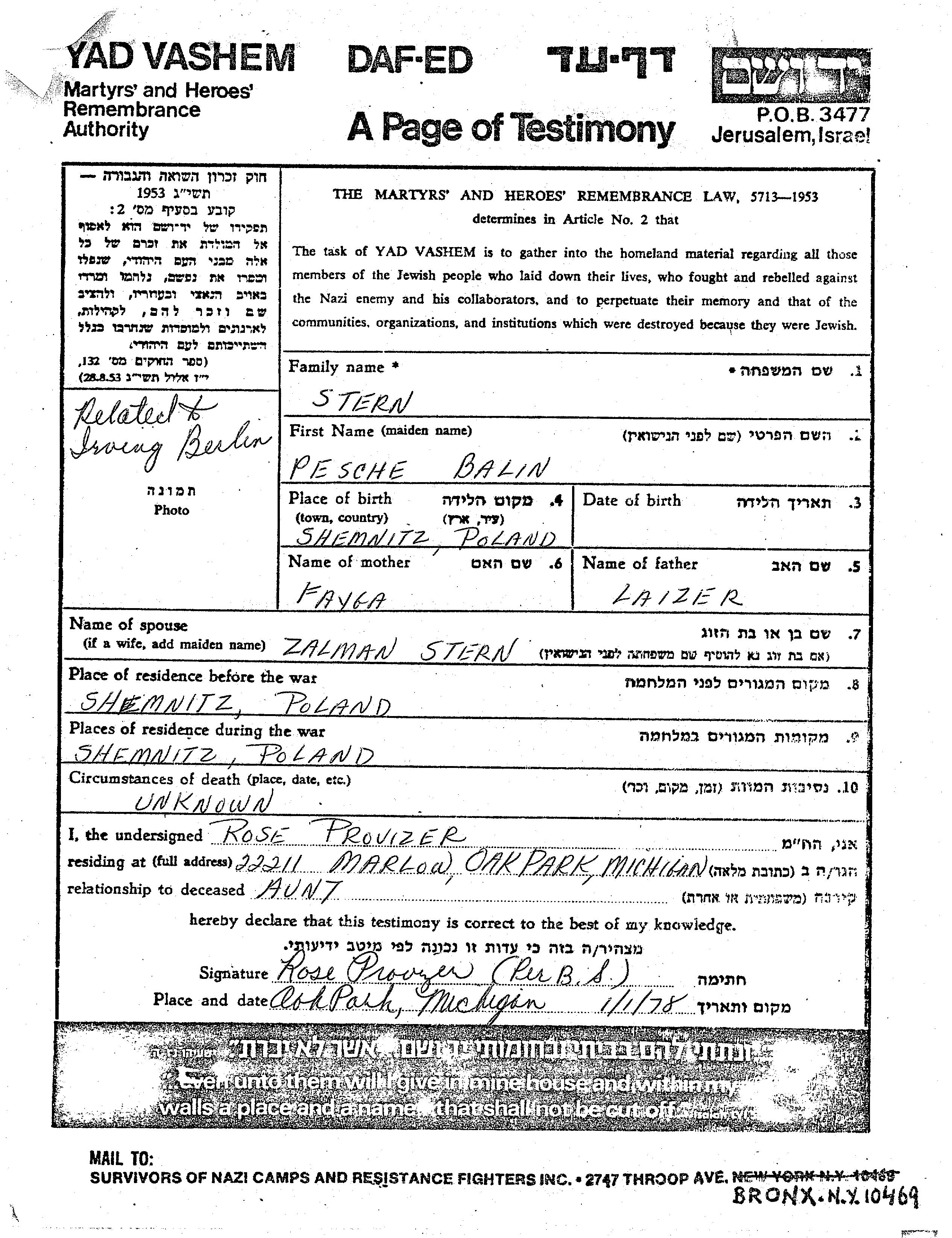 Pesche Stern, geb. Balin wurde in Siemnice, Polen geboren. Sie war die Tochter von Laizer und Fayga. Sie war mit Zalman Verheiratet. Vor dem Zweiten Weltkrieg lebte sie in Siemnice, Polen. Während des Krieges war sie in Siemnice, Polen.