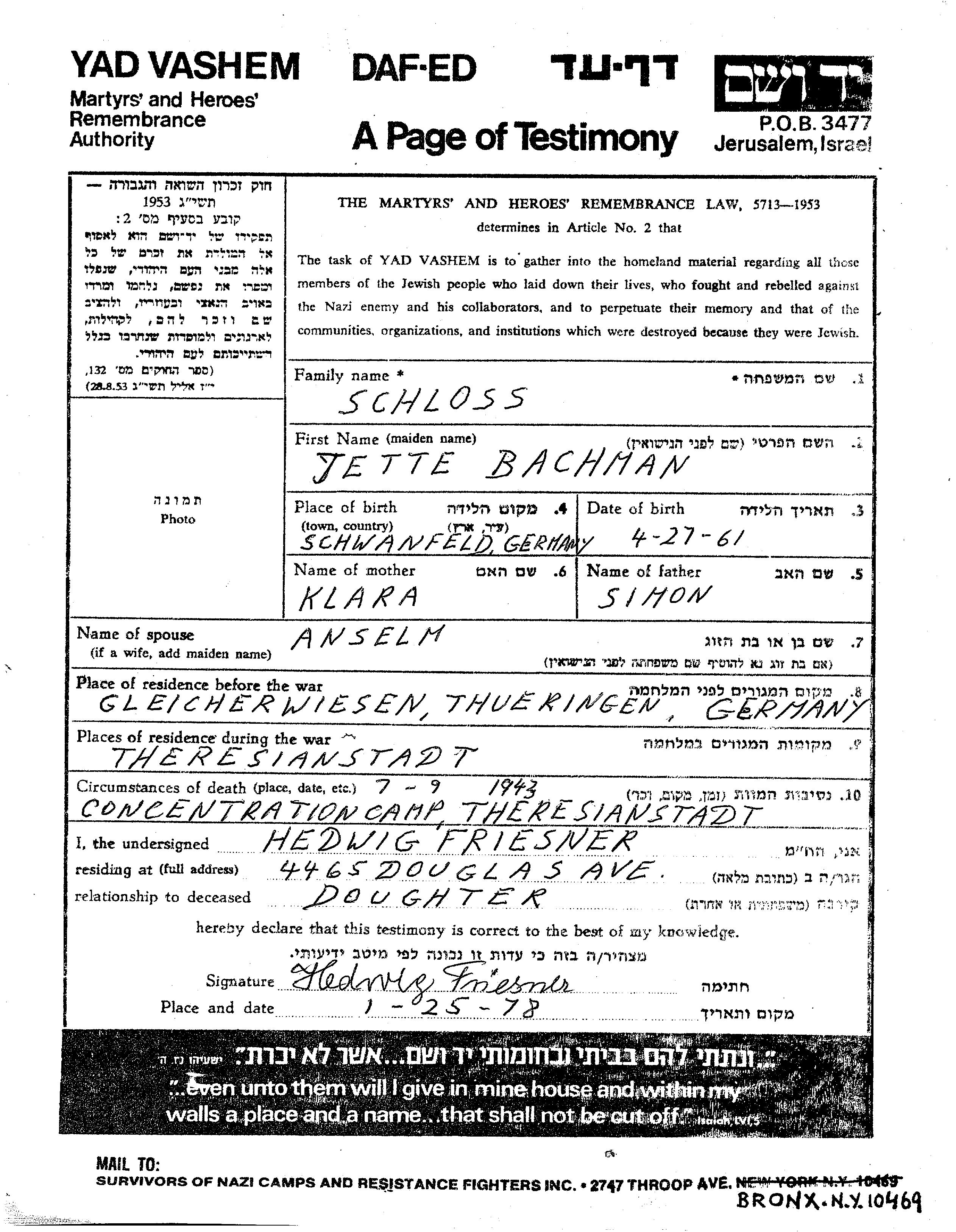 Jette Schloss, geb. Bachman wurde im Jahr 1861 in Schwanfeld, Deutsches Reich geboren. Sie war die Tochter von Simon und Klara. Sie war mit Anselm Verheiratet. Vor dem Zweiten Weltkrieg lebte sie in Gleicherwiesen, Deutsches Reich. Während des Krieges war sie in Theresienstadt, Tschechoslowakei.