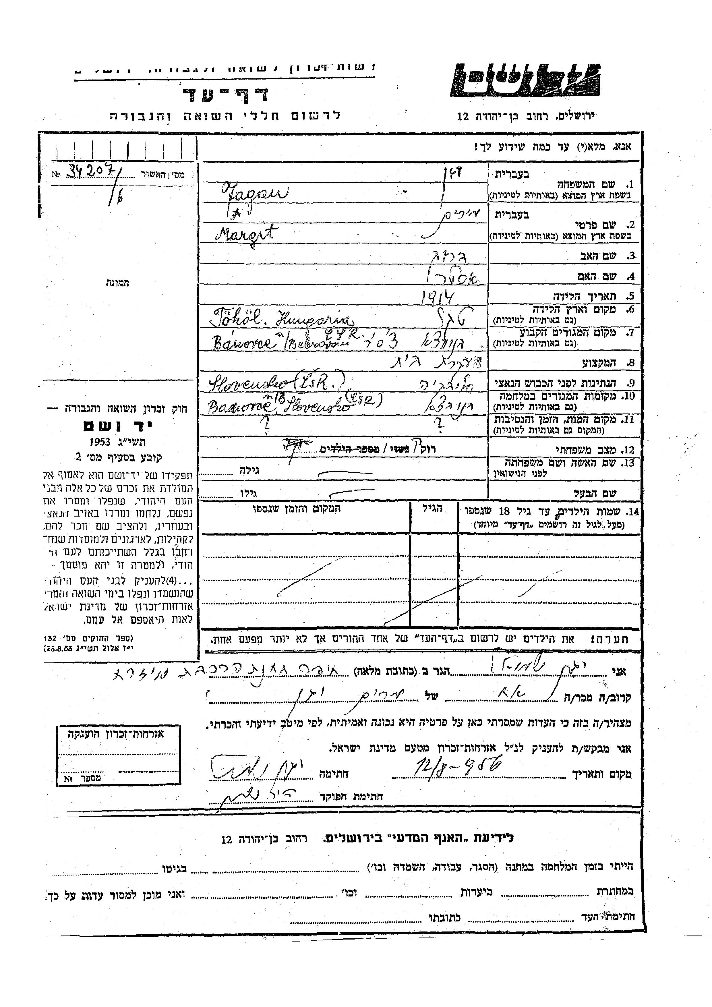 Margit Miriam Jagan wurde im Jahr 1914 in Tohol, Tschechoslowakei geboren. Sie war die Tochter von Barukh und Ester. Sie war Hausfrau und Ledig. Vor dem Zweiten Weltkrieg lebte sie in Banovce Bebravou, Tschechoslowakei. Während des Krieges war sie in Banovce Bebravou, Tschechoslowakei.