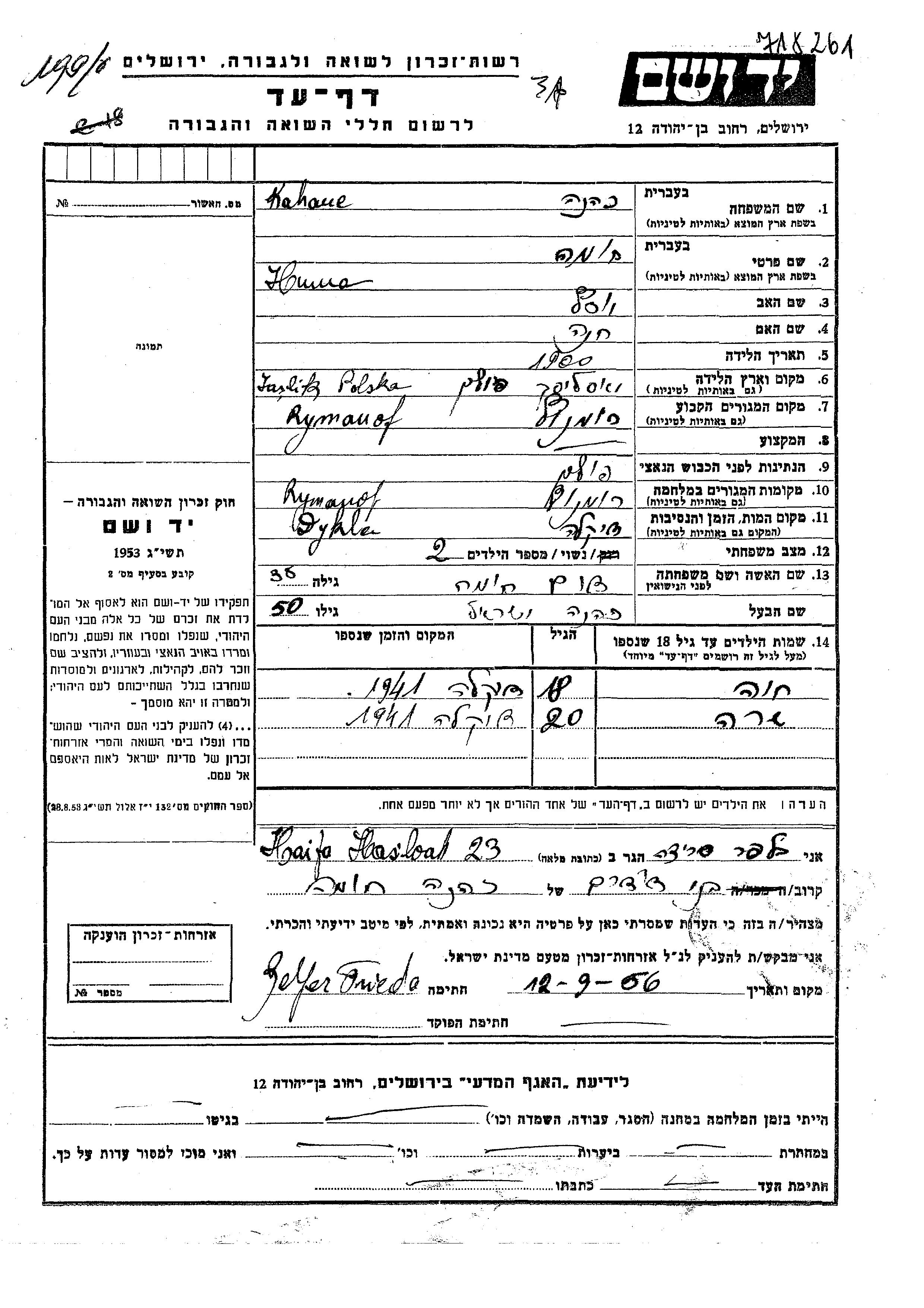 Huma Kahane, geb. Dum wurde im Jahr 1900 in Jasliska, Polen geboren. Sie war die Tochter von Yosef und Khana. Sie war mit Yisrael Verheiratet. Vor dem Zweiten Weltkrieg lebte sie in Rymanov, Polen. Während des Krieges war sie in Rymanov, Polen.