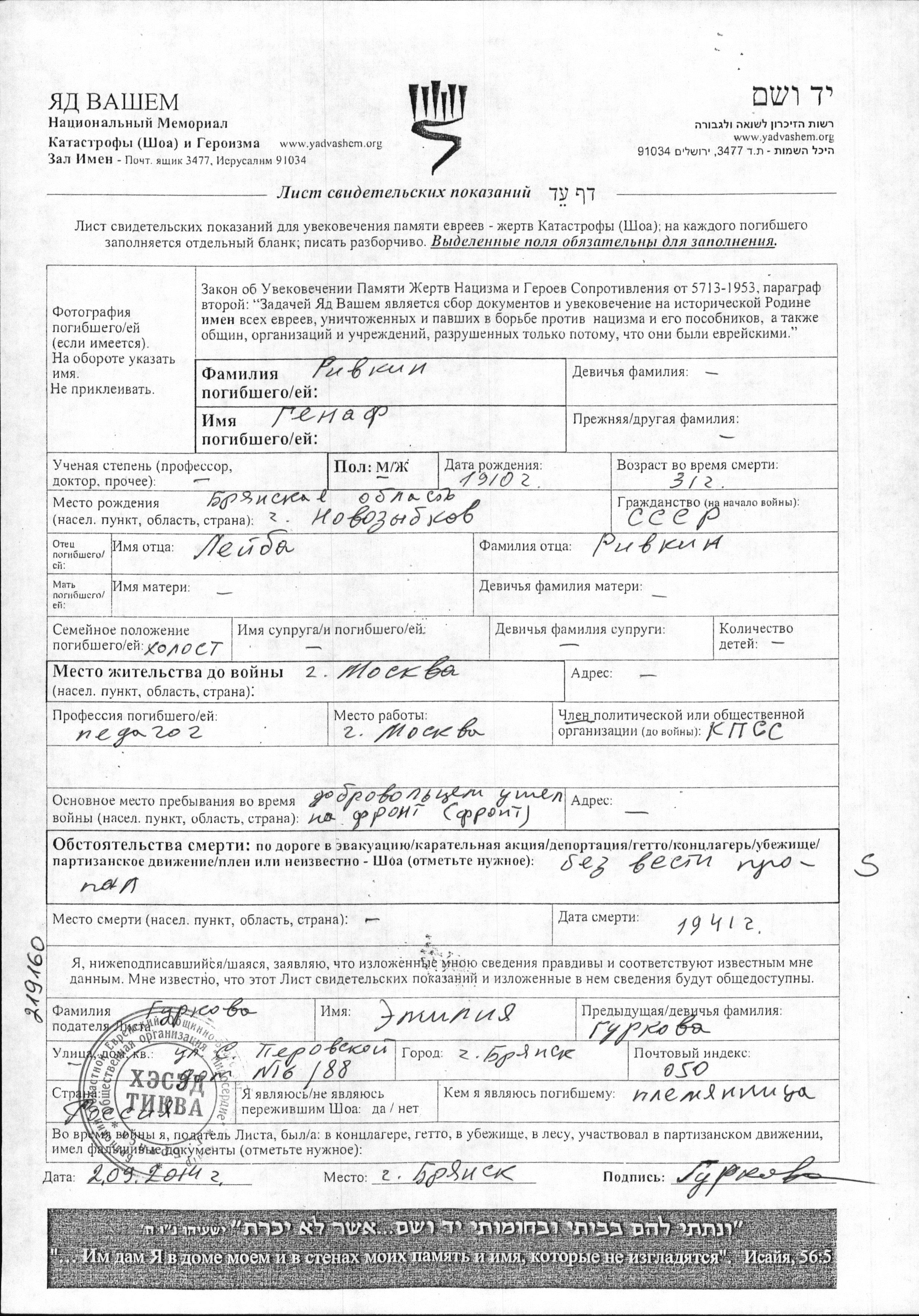 Genaf Rivkin wurde im Jahr 1910 in Novozybkov, Russland (UdSSR) geboren. Er war der Sohn von Leyba. Er war Pedagog und Ledig. Vor dem Zweiten Weltkrieg lebte er in Moskva, Russland (UdSSR). Während des Krieges war er in die Sowjetischen Streitkräfte.