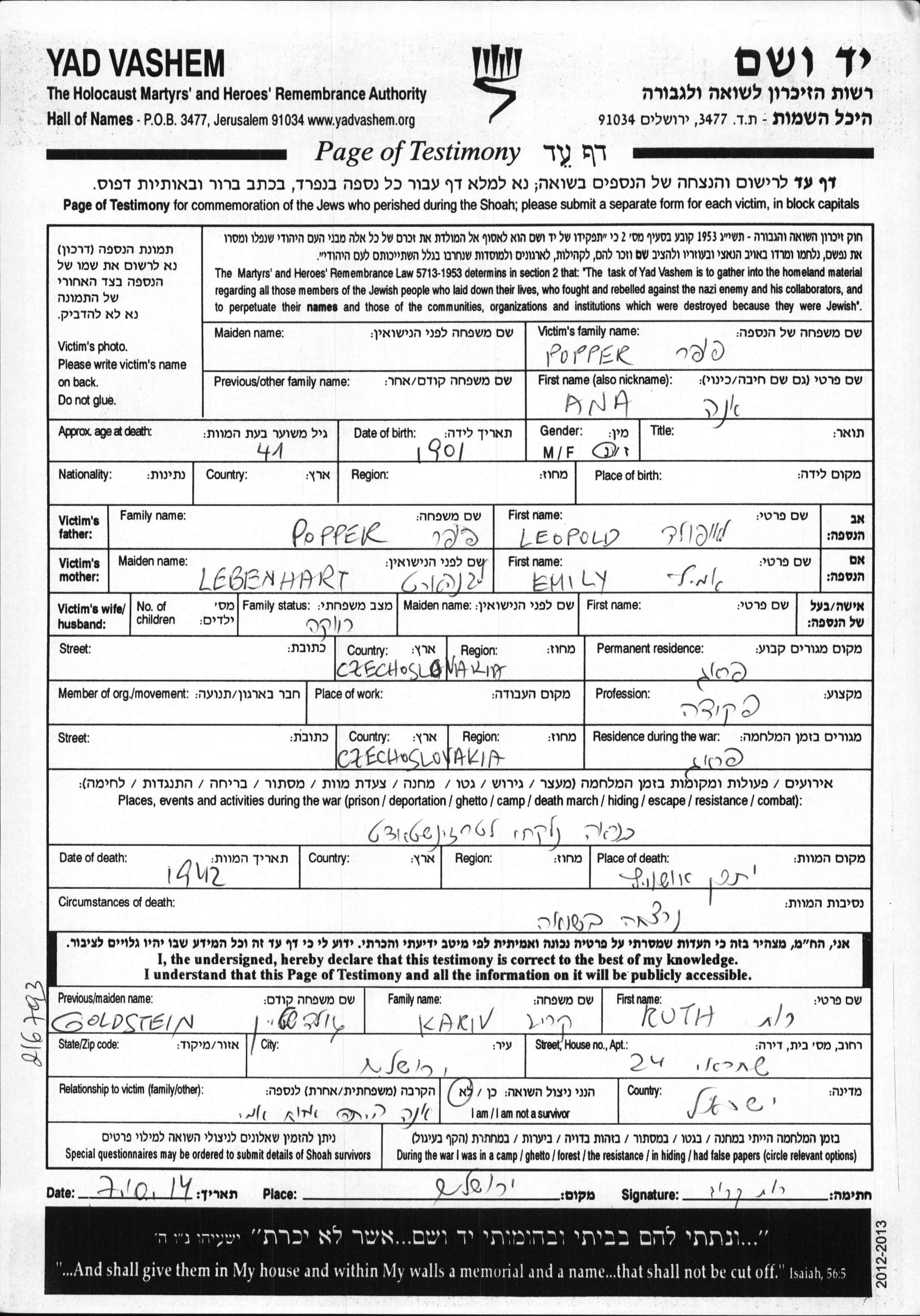 Ana Popper wurde im Jahr 1901 geboren. Sie war die Tochter von Leopold und Emily, geb. Lebenhart. Sie war Angestellte/-r und Ledig. Vor dem Zweiten Weltkrieg lebte sie in Prague, Tschechoslowakei. Während des Krieges war sie in Auschwitz, Polen.