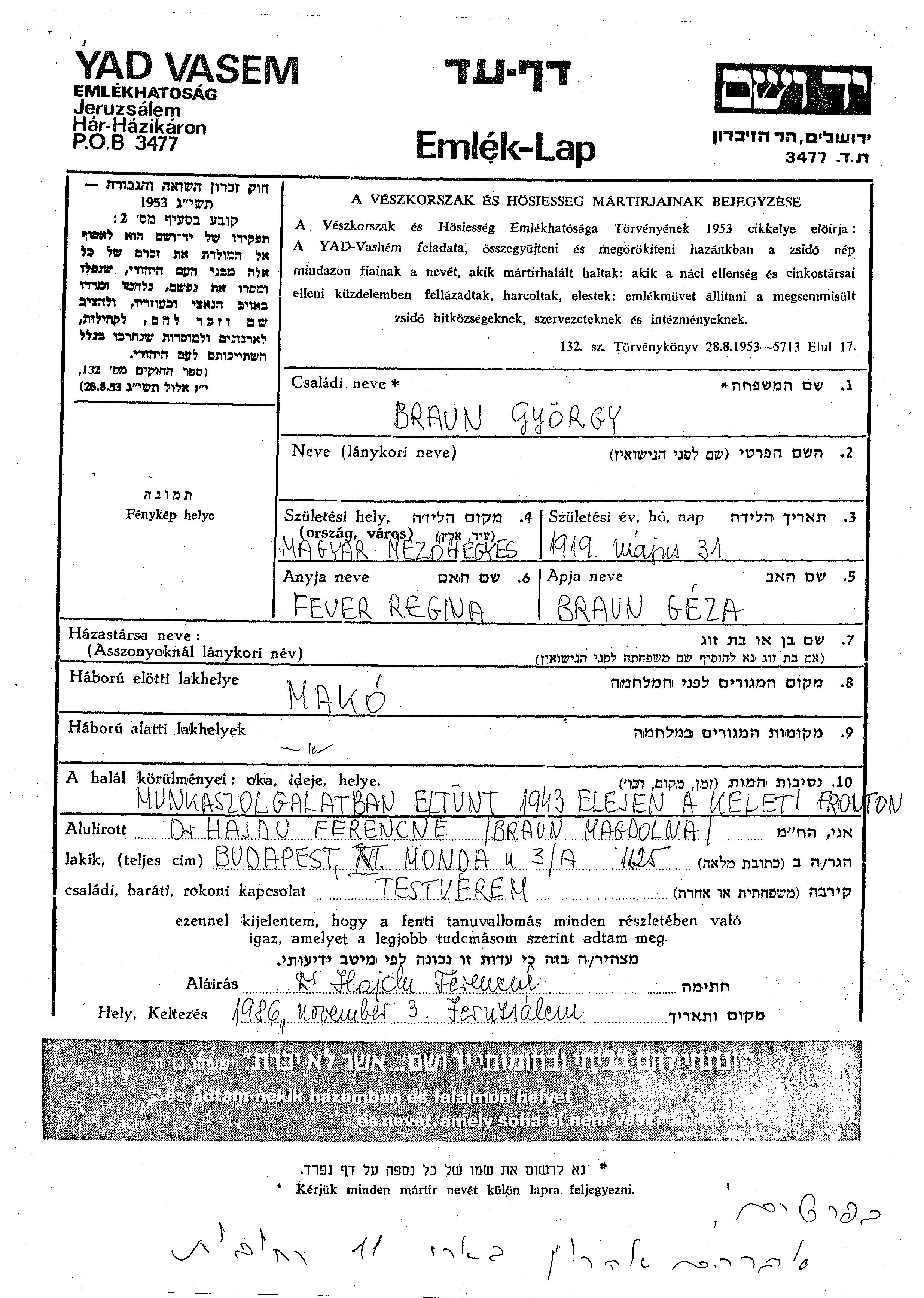 Gyorgy Braun wurde im Jahr 1919 in Mezohegyes, Ungarn geboren. Er war der Sohn von Geza und Regina. Vor dem Zweiten Weltkrieg lebte er in Mako, Ungarn. Während des Krieges war er in Mako, Ungarn.
