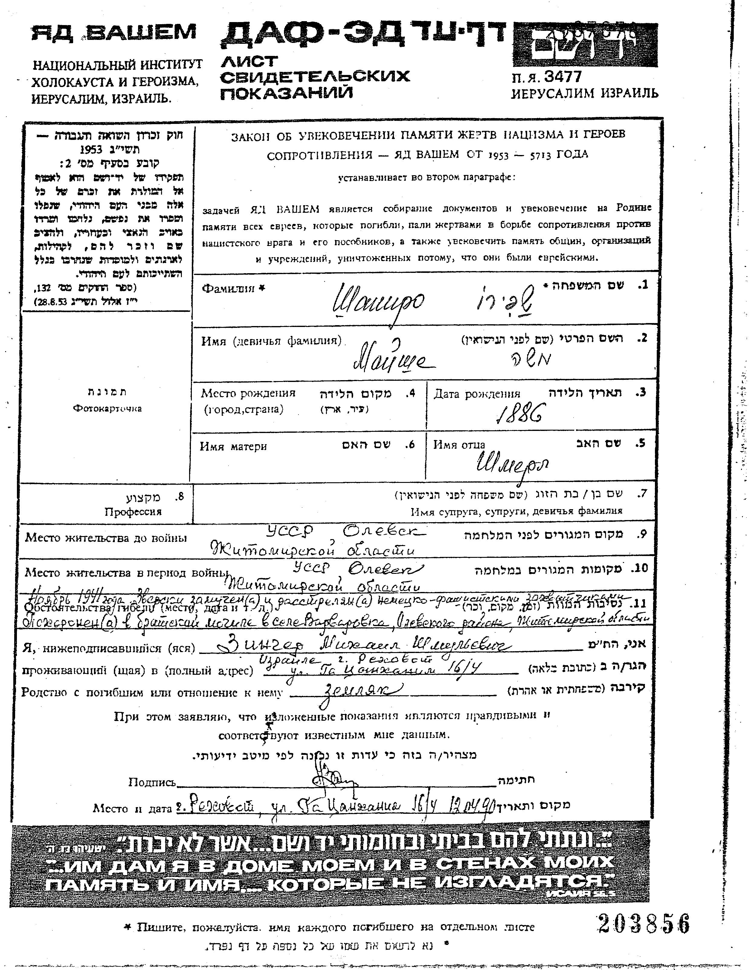 Shapiro Moishe 1886 Olevsk, Ukraine (UdSSR) Gedenkblatt