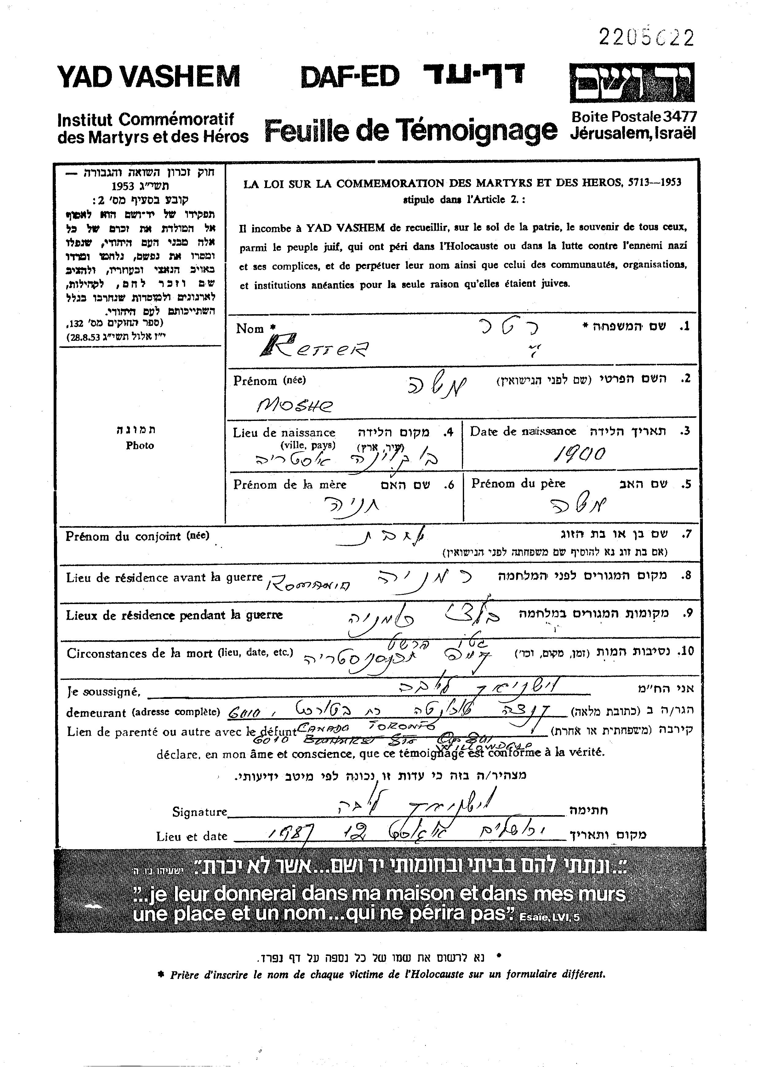 Moshe Retter wurde im Jahr 1900 in Rumänien geboren. Er war der Sohn von Moshe und Khanya Khenia. Er war mit Yokhevet Verheiratet. Vor dem Zweiten Weltkrieg lebte er in Beltz, Rumänien. Während des Krieges war er in Beltz, Rumänien.