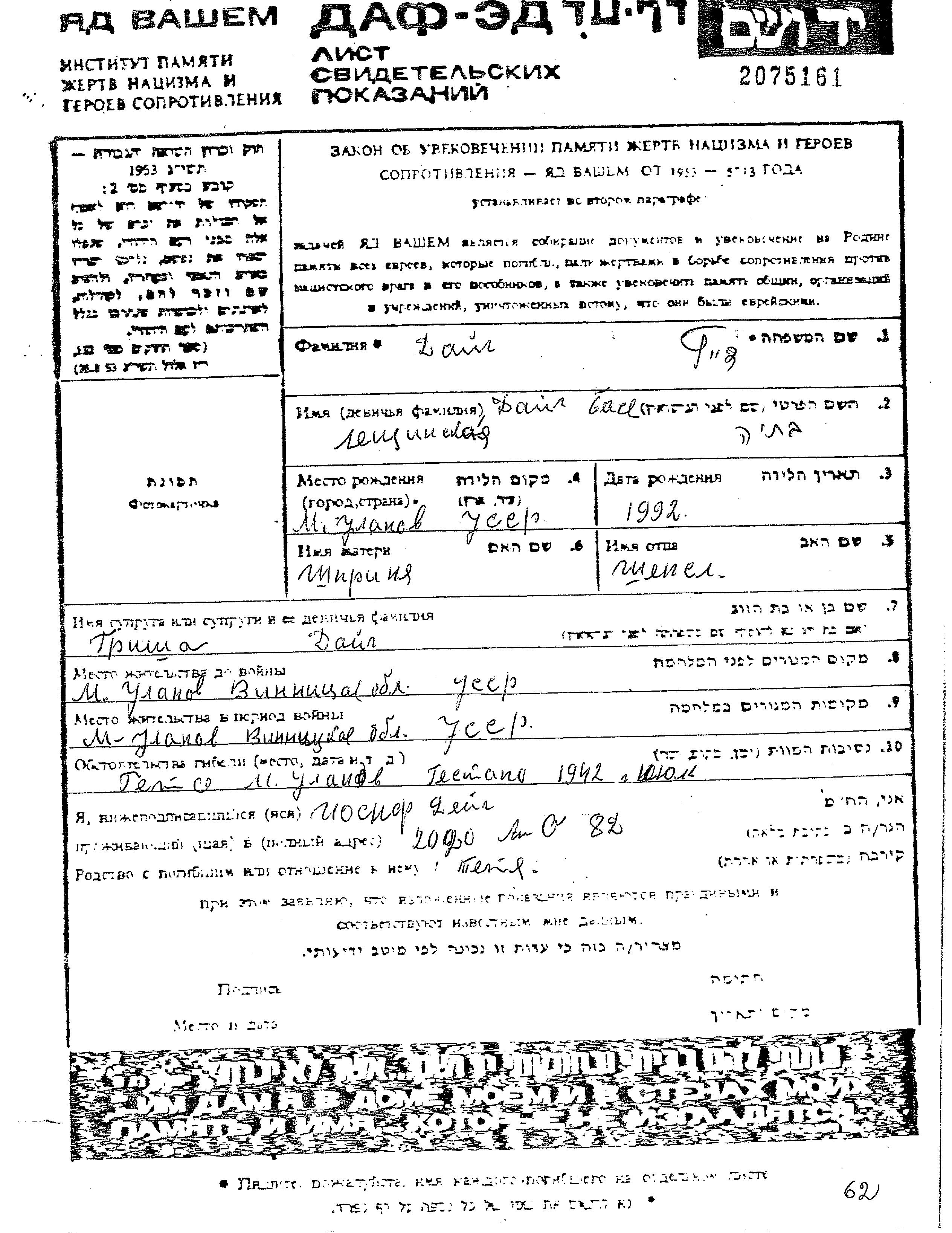 Basya Daich, geb. Leshchinski wurde im Jahr 1892 in Ulanov, Ukraine (UdSSR) geboren. Sie war die Tochter von Shepsl und Shprinya. Sie war mit Grisha Verheiratet. Vor dem Zweiten Weltkrieg lebte sie in Ulanov, Ukraine (UdSSR). Während des Krieges war sie in Ulanov, Ukraine (UdSSR).