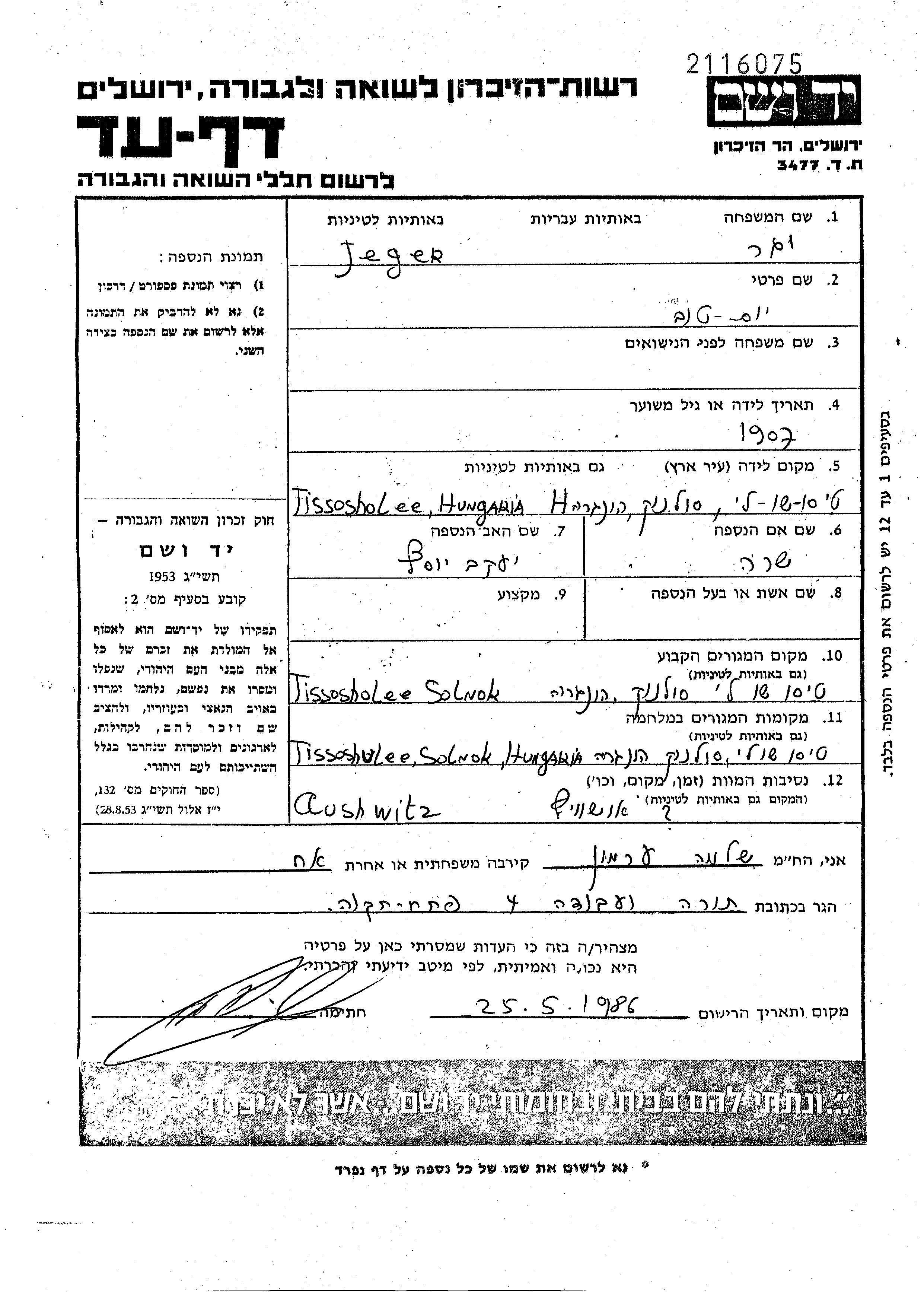 Yom Tov Jeger wurde im Jahr 1907 in Tiszasuly, Ungarn geboren. Er war der Sohn von Jaacov Josef und Sarah. Vor dem Zweiten Weltkrieg lebte er in Tiszasuly, Ungarn. Während des Krieges war er in Tiszasuly, Ungarn.
