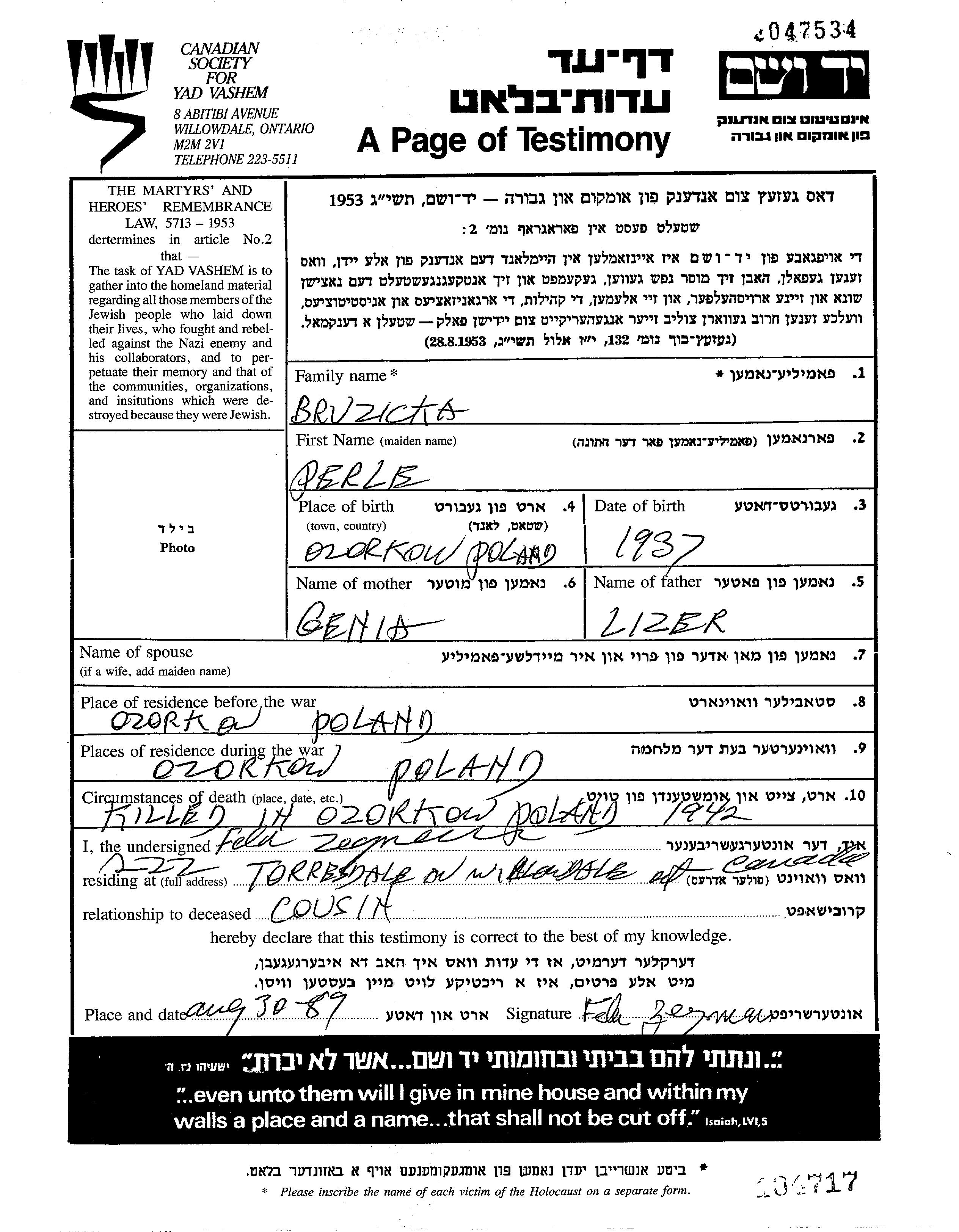 Perla Bruzicka wurde im Jahr 1937 in Ozorkow, Polen geboren. Sie war die Tochter von Eliezer und Genia. Sie war Kind. Vor dem Zweiten Weltkrieg lebte sie in Ozorkow, Polen. Während des Krieges war sie in Ozorkow, Polen.