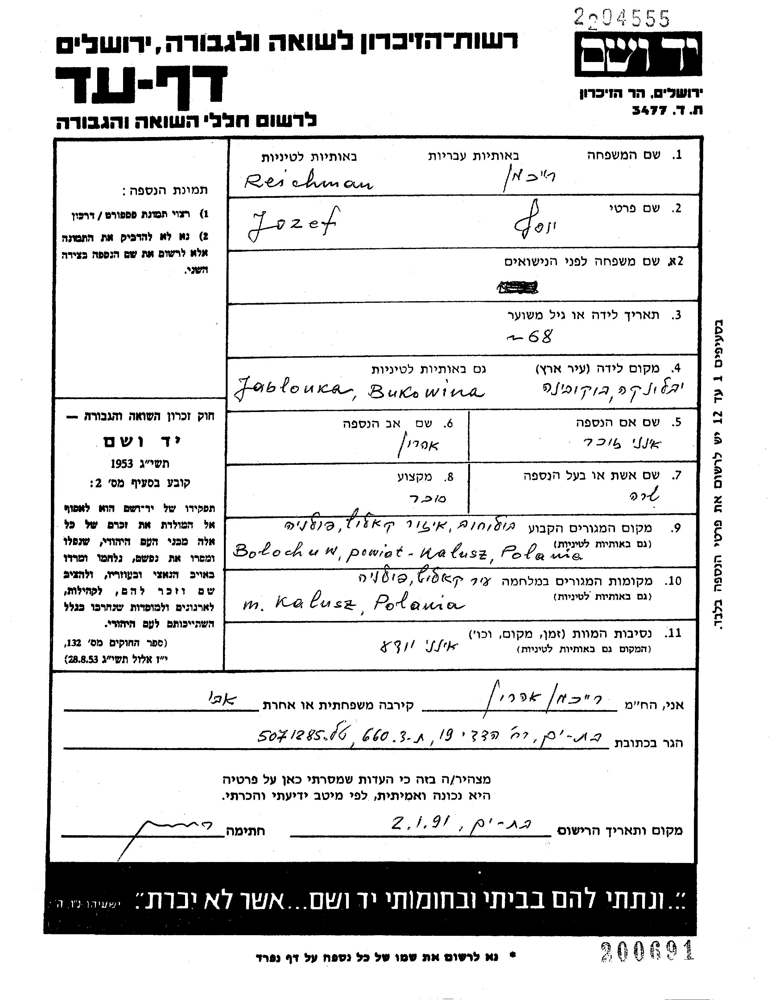 Yozef Reichman wurde in Iablonita, Rumänien geboren. Er war der Sohn von Aharon. Er war Kaufmann/-frau und mit Sara Verheiratet. Vor dem Zweiten Weltkrieg lebte er in Bolechow, Polen. Während des Krieges war er in Kalusz, Polen.