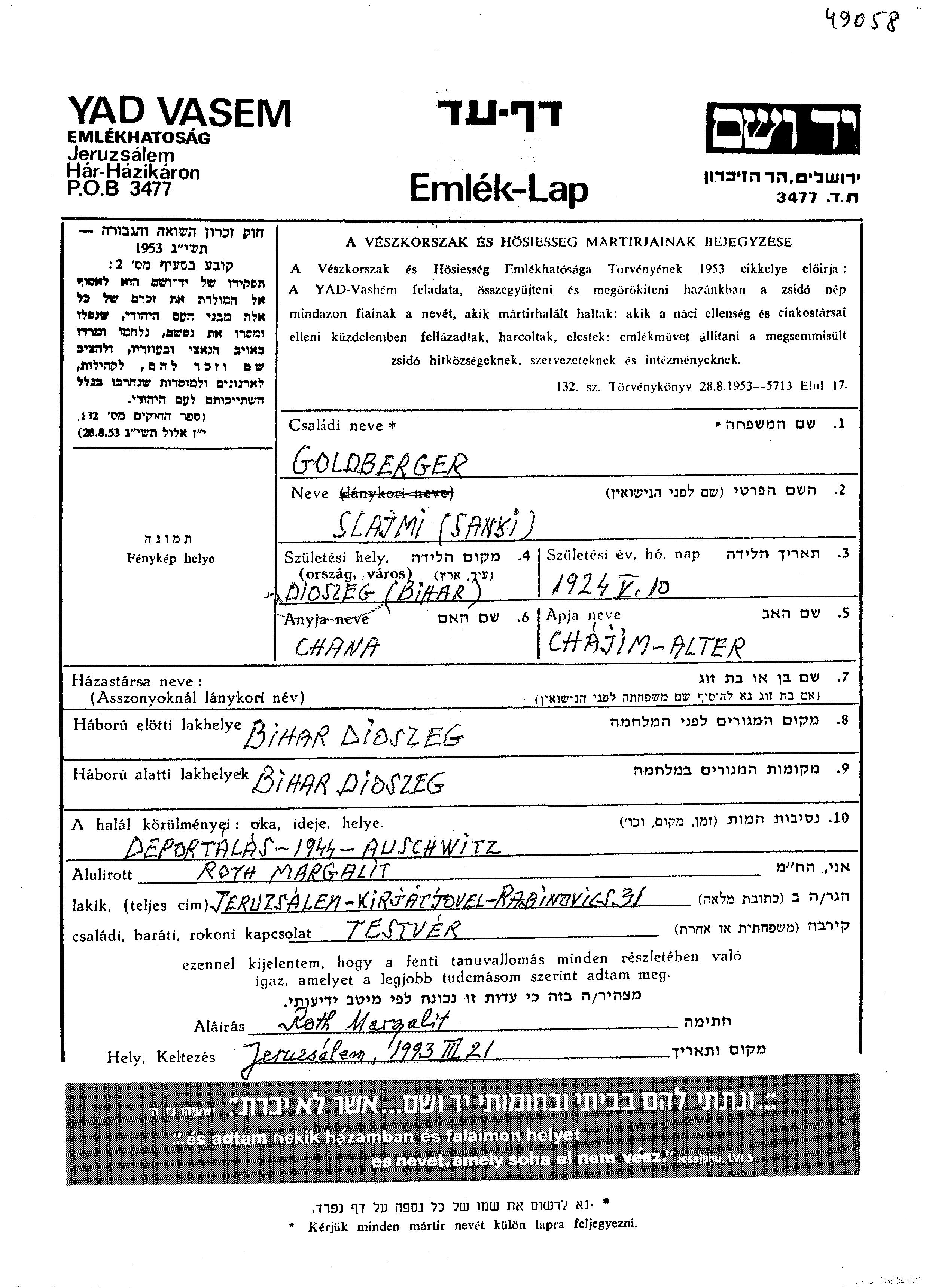 Slajmi Sanyi Goldberger wurde im Jahr 1924 in Bihardioszeg, Rumänien geboren. Er war der Sohn von Chajim Alter und Chana. Vor dem Zweiten Weltkrieg lebte er in Bihardioszeg, Rumänien. Während des Krieges war er in Bihardioszeg, Rumänien.