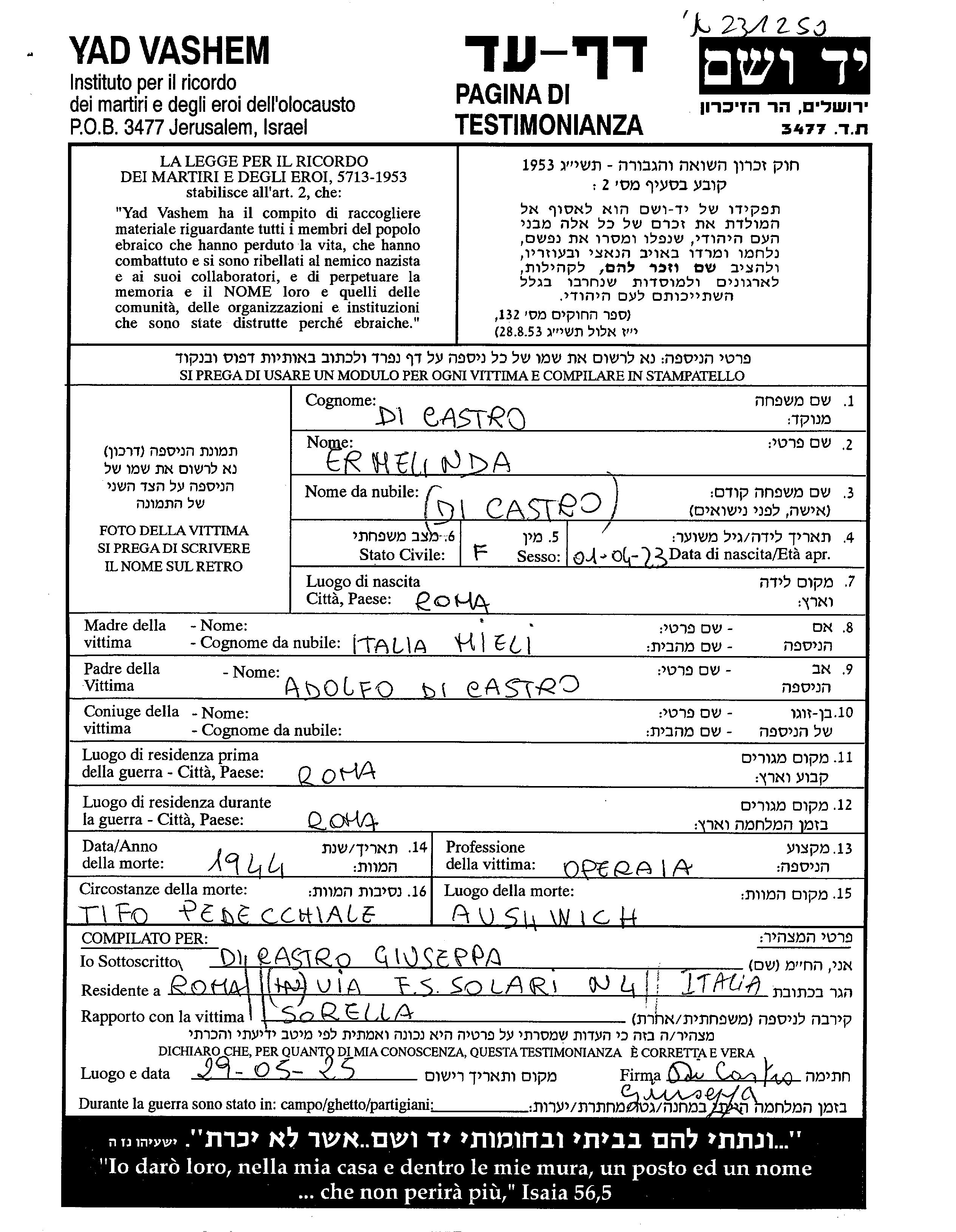 Ermelinda Di Castro wurde im Jahr 1924 in Roma, Italien geboren. Sie war die Tochter von Adolfo und Italia. Sie war Ledig. Vor dem Zweiten Weltkrieg lebte sie in Roma, Italien. Während des Krieges war sie in Roma, Italien.