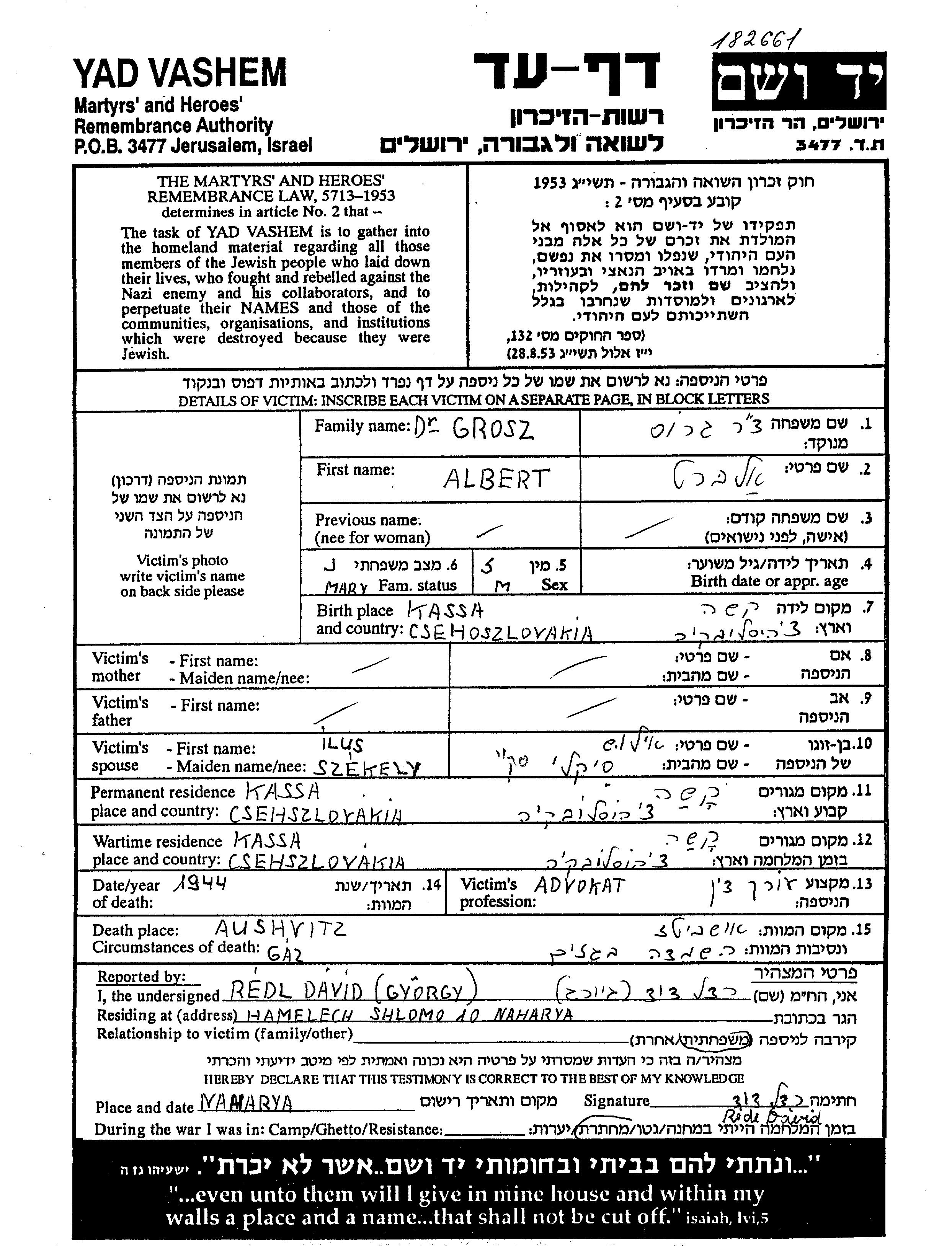 Dr. Grosz wurde in der Schoah ermordet. Todesort: Auschwitz, Polen im Jahr 1944.