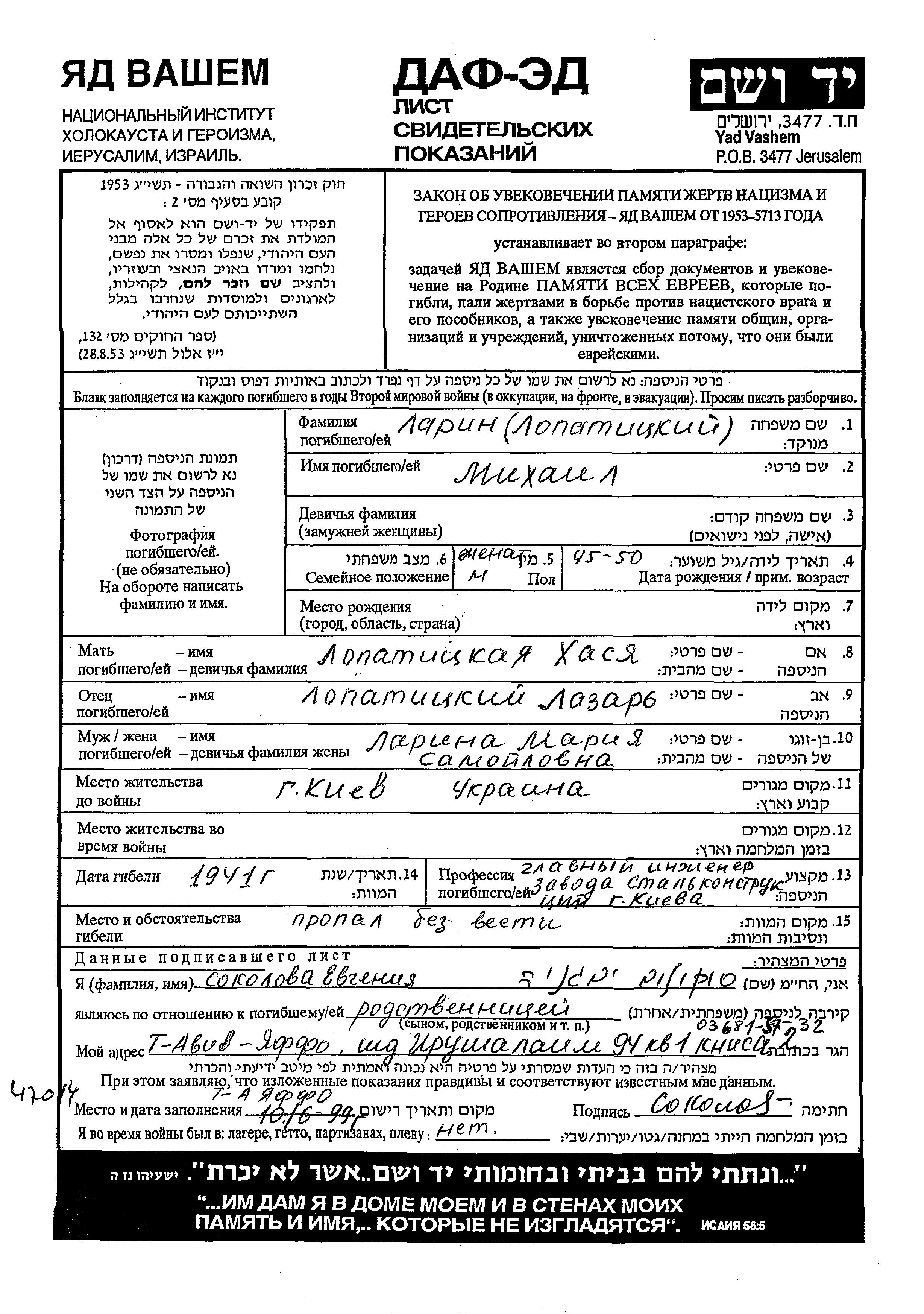 Mikhail wurde in der Schoah ermordet. Todesort: unbekannt im Jahr 1941.