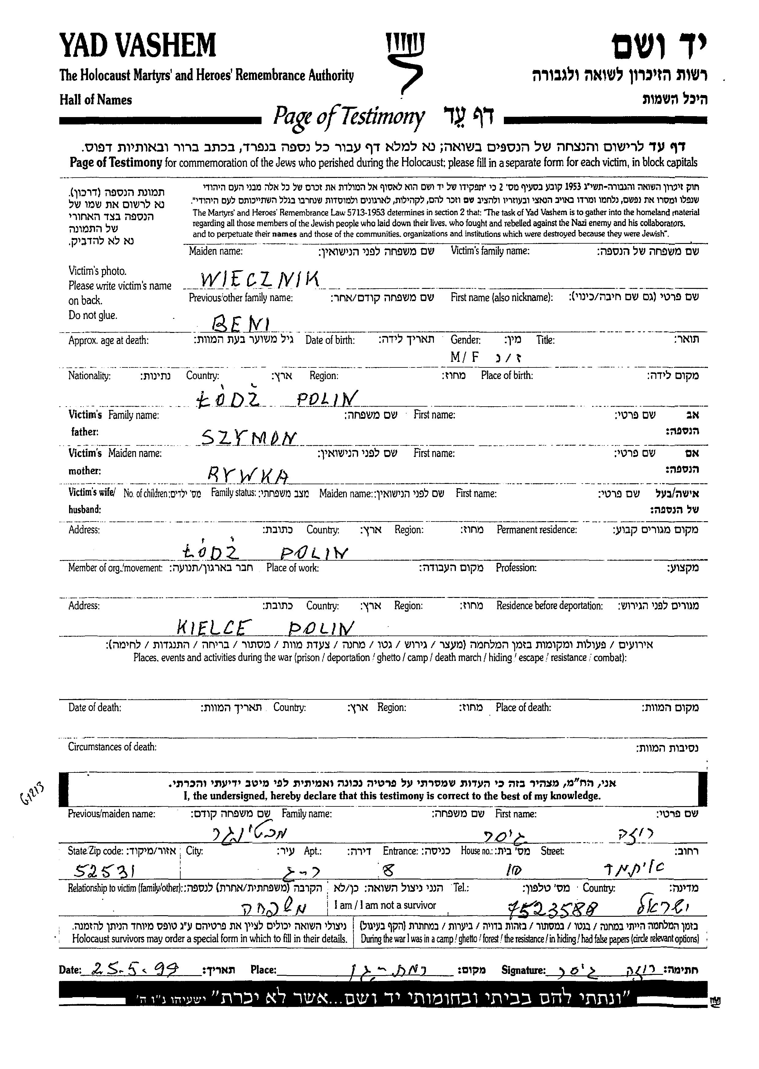 Beni Wiecznik wurde in Lodz, Polen geboren. Er war der Sohn von Szymon und Rywka. Vor dem Zweiten Weltkrieg lebte er in Lodz, Polen. Während des Krieges war er in Kielce, Polen.