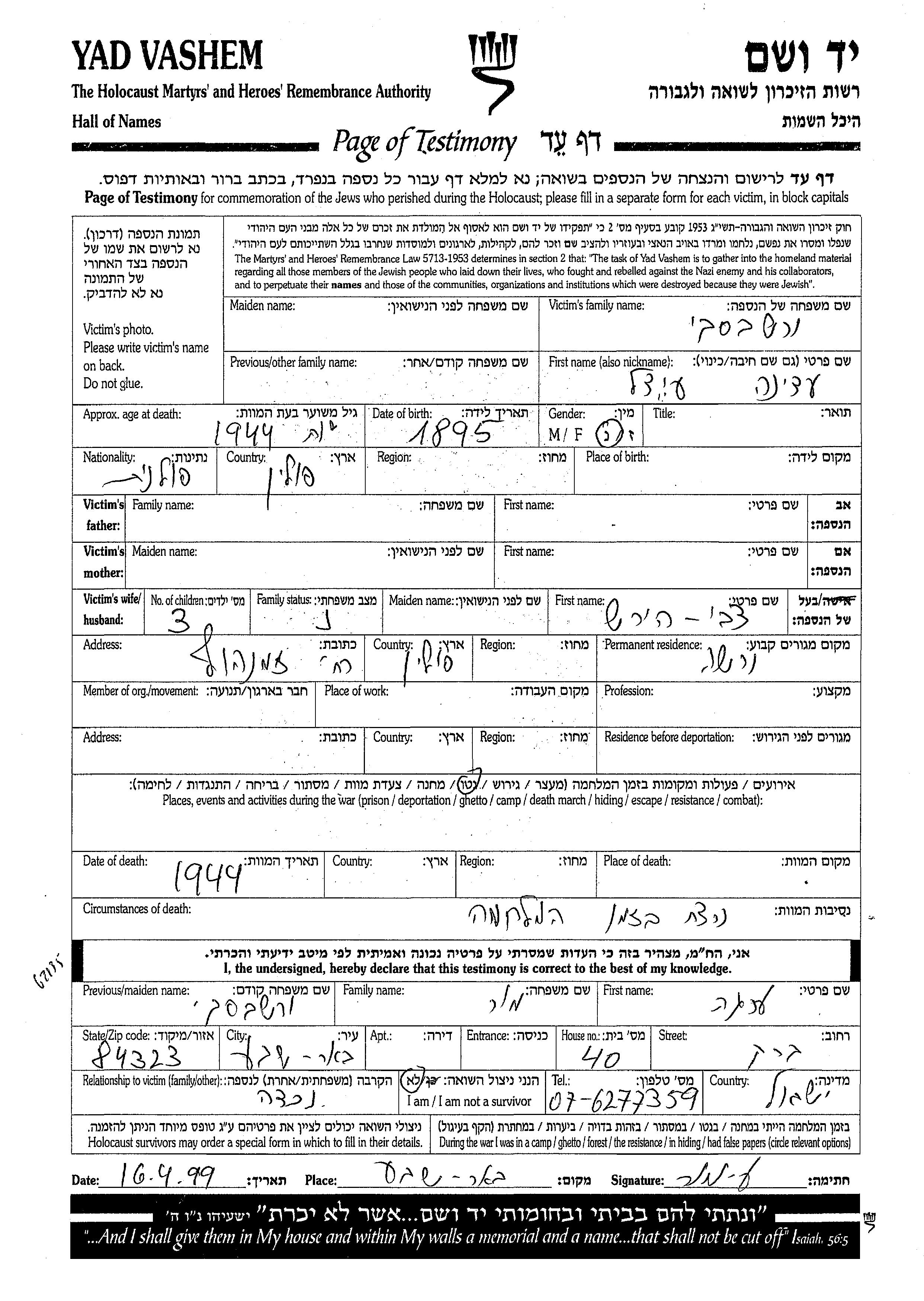 Adina wurde in der Schoah ermordet. Todesort: unbekannt im Jahr 1944.
