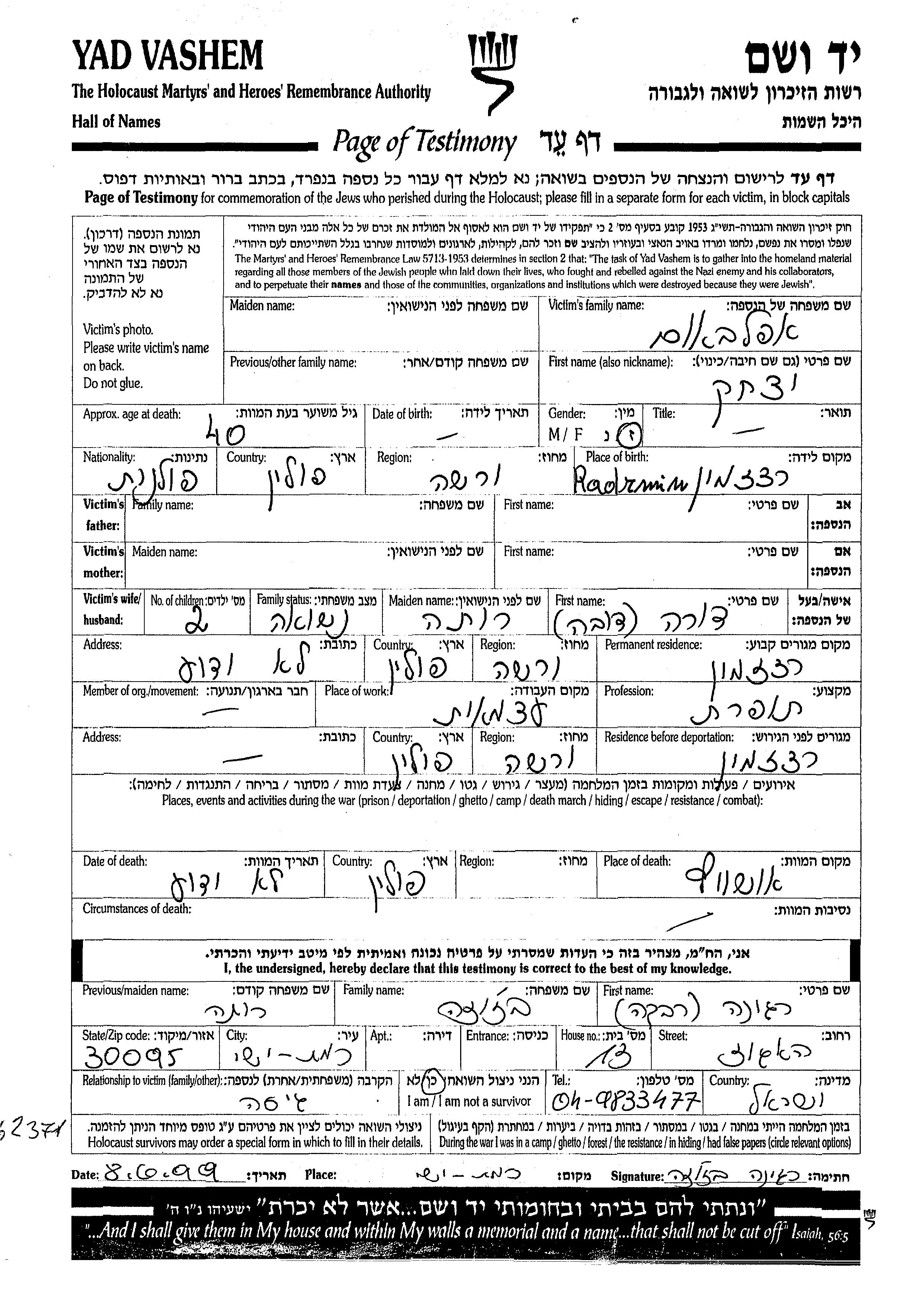 Apelbaum Yitzkhak Radzymin, Polen Gedenkblatt