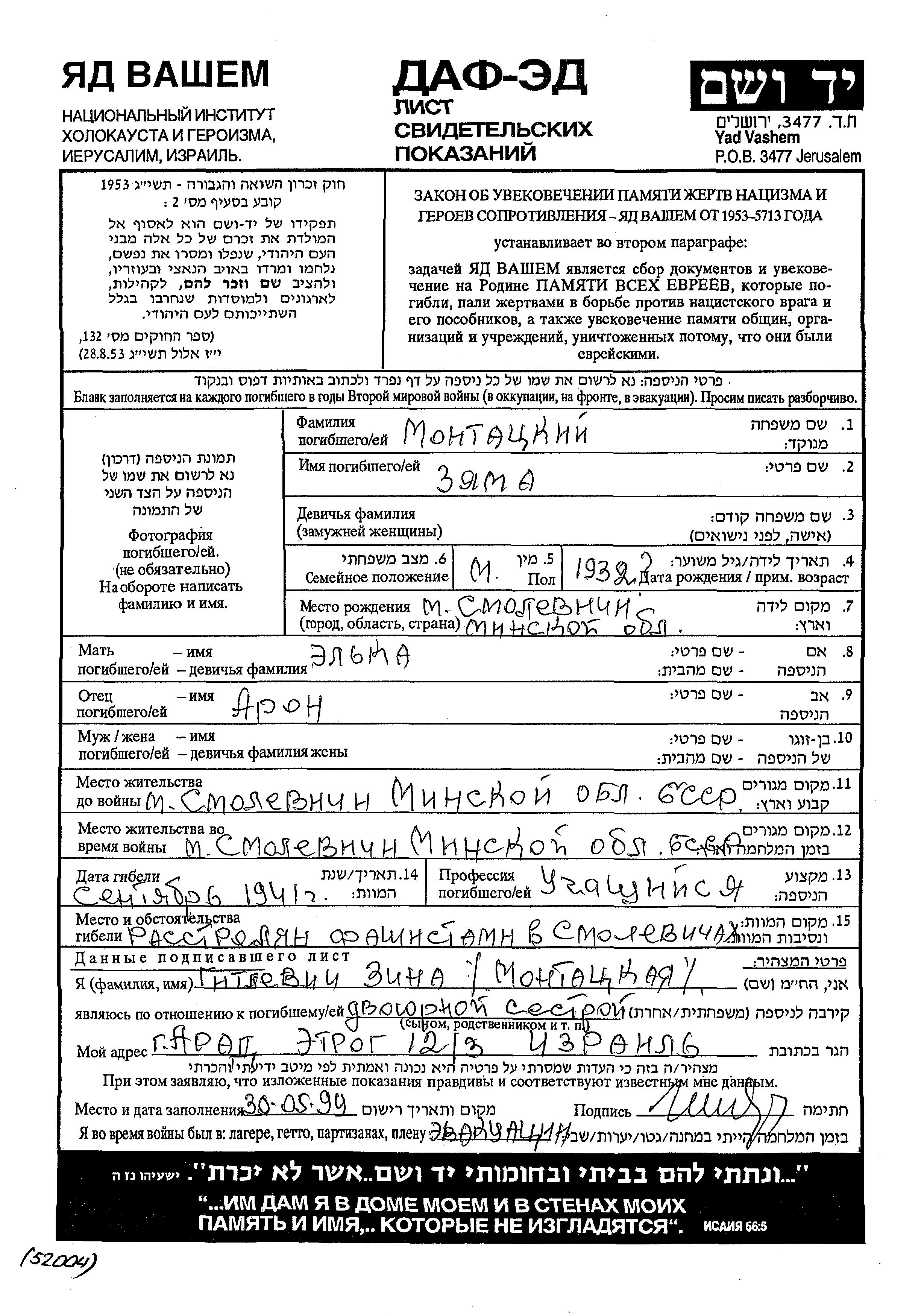 Zyama Montatzki wurde im Jahr 1932 in Smolevichi, Weißrussland (UdSSR) geboren. Er war der Sohn von Aron und Elka. Er war Schüler/-in und Ledig. Vor dem Zweiten Weltkrieg lebte er in Smolevichi, Weißrussland (UdSSR). Während des Krieges war er in Smolevichi, Weißrussland (UdSSR).