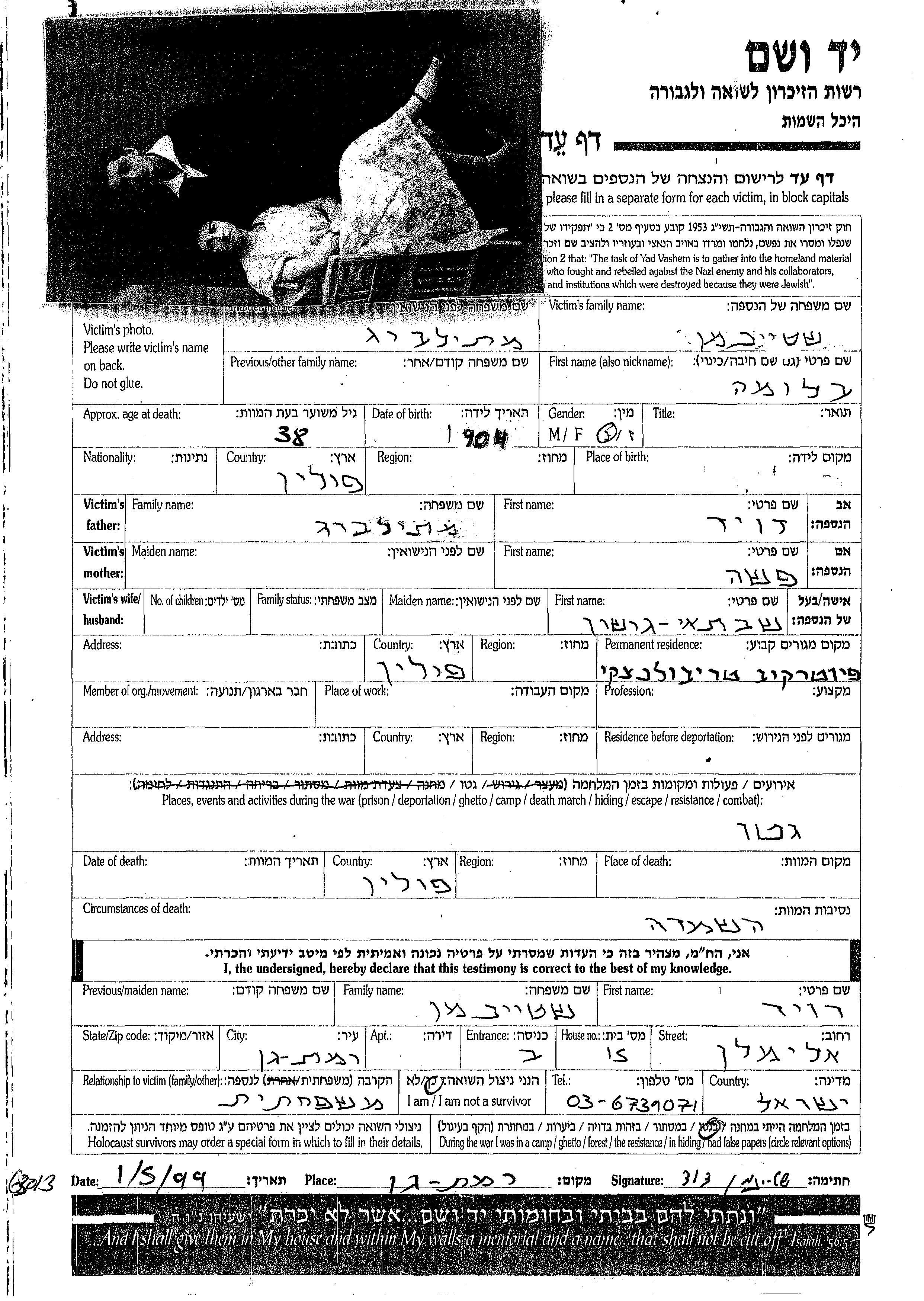 Bluma Shteinman, geb. Matelberg wurde im Jahr 1904 in Polen geboren. Sie war die Tochter von David und Pasha. Sie war mit Shabtai Gershon Verheiratet. Vor dem Zweiten Weltkrieg lebte sie in Piotrkow Trybunalski, Polen. Während des Krieges war sie in Piotrkow Trybunalski, Polen.
