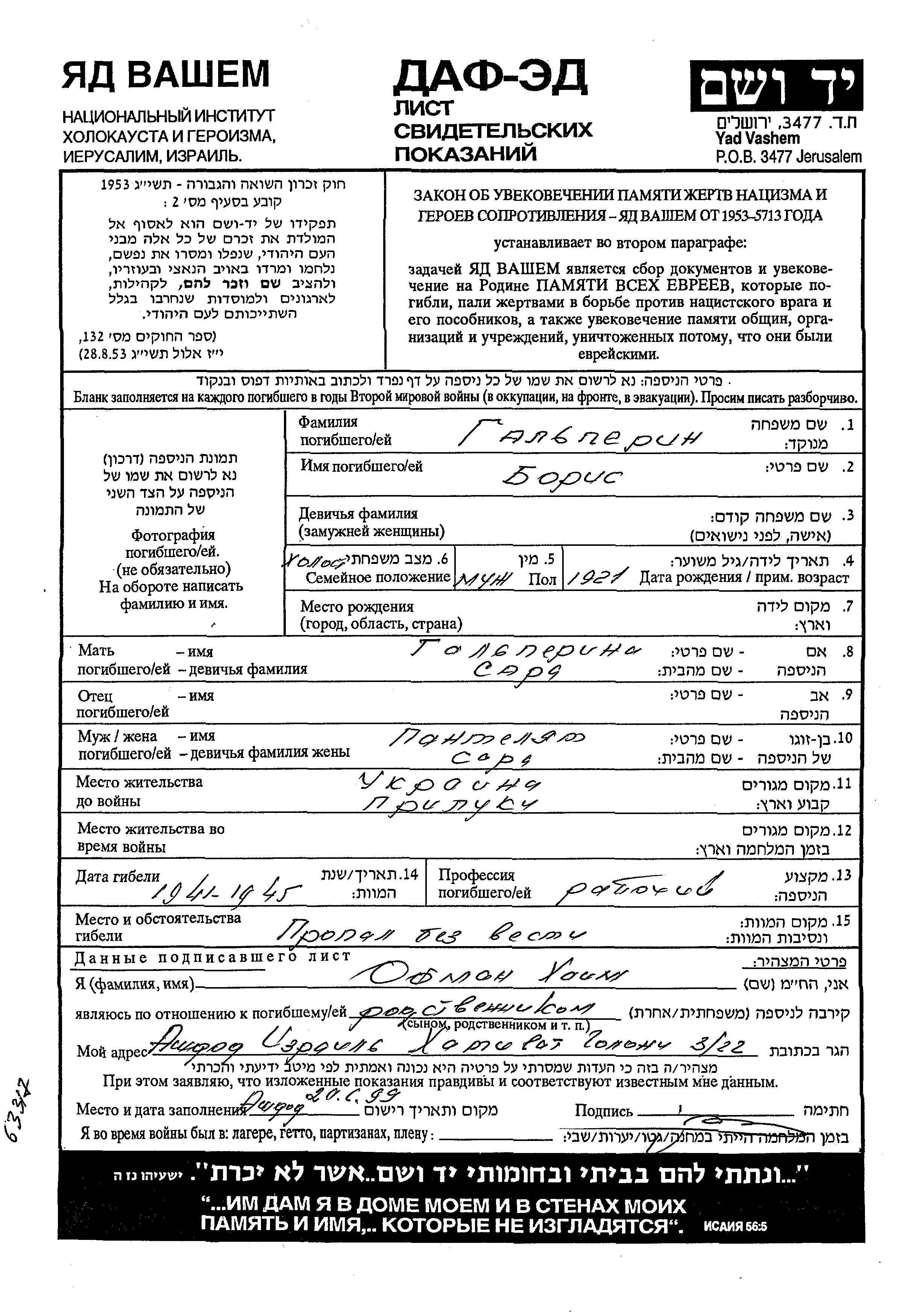 Galperin Boris 1921 Priluki, Ukraine (UdSSR) Gedenkblatt