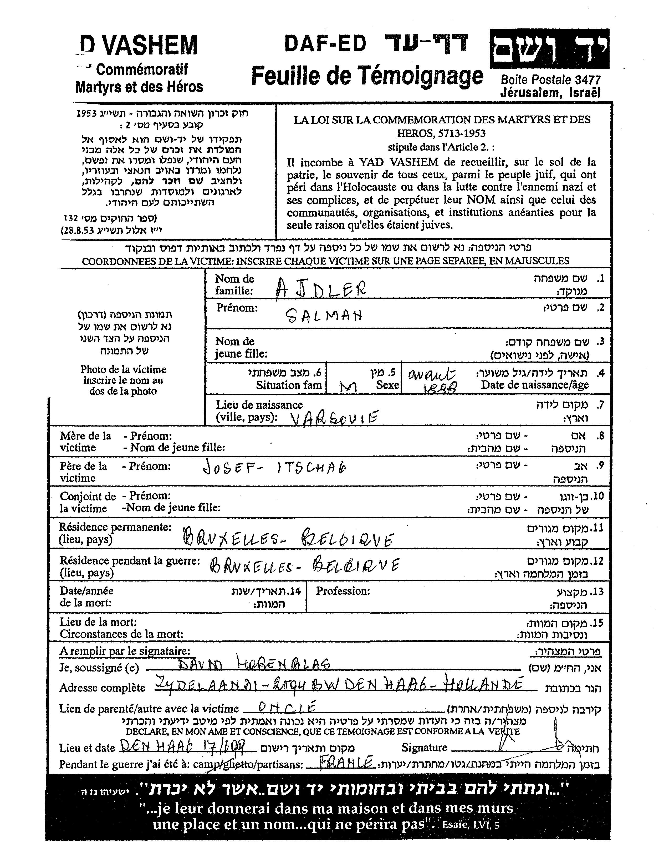 Salman Ajdler נולד בVarsovia שבPolen בשנת 1888 לJosef Itschag. לפני מלחמת העולם השניה התגורר בBruxelles שבBelgien. בזמן המלחמה הוא היה בBruxelles שבBelgien.