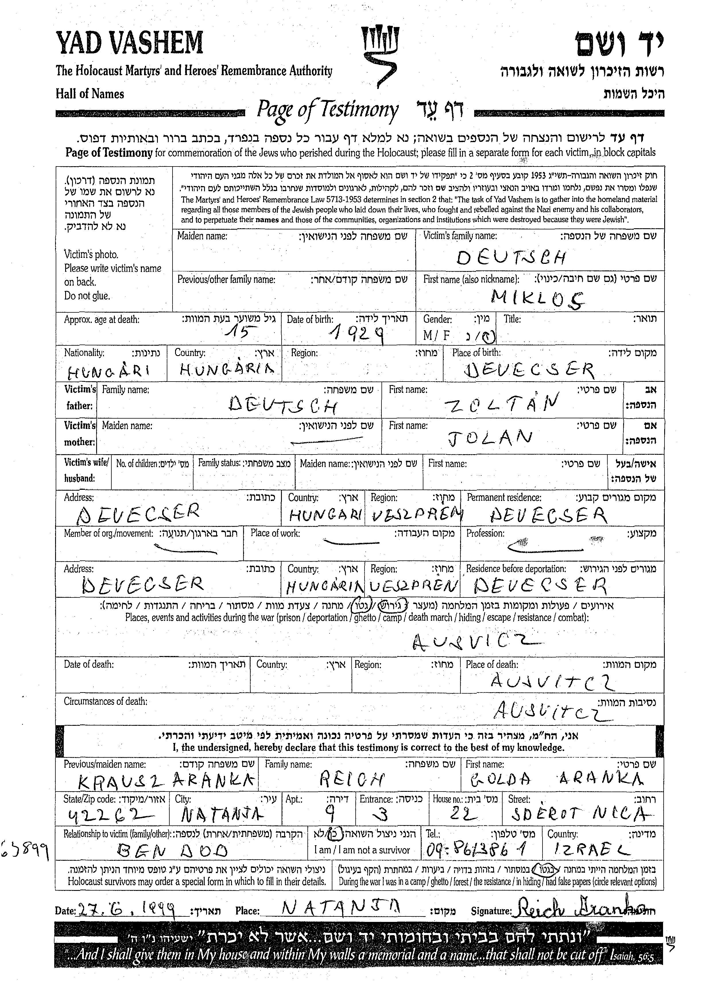 Miklos wurde in der Schoah ermordet. Todesort: Auschwitz, Polen.