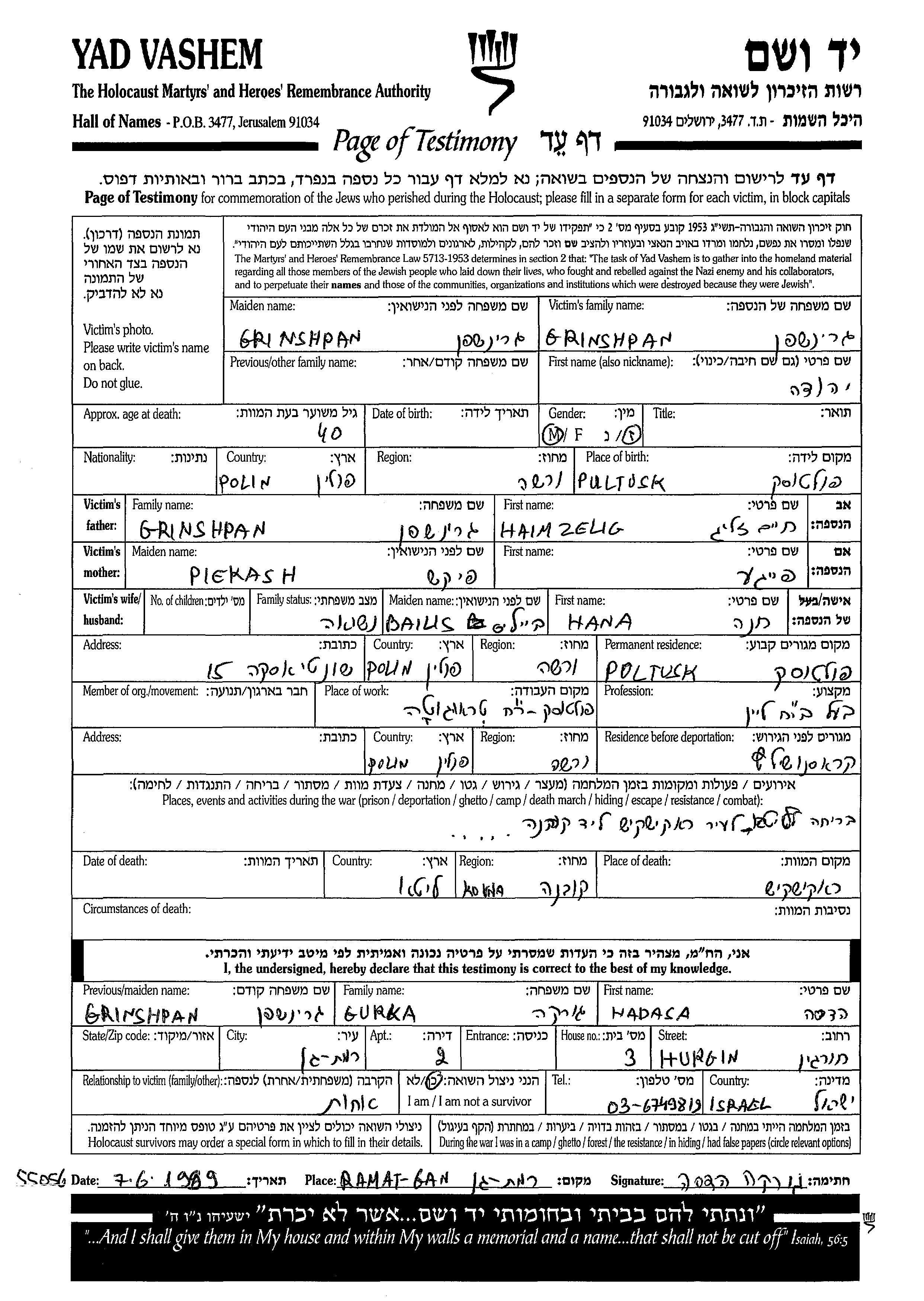 Grinshpan Yehuda Pultusk, Polen Gedenkblatt