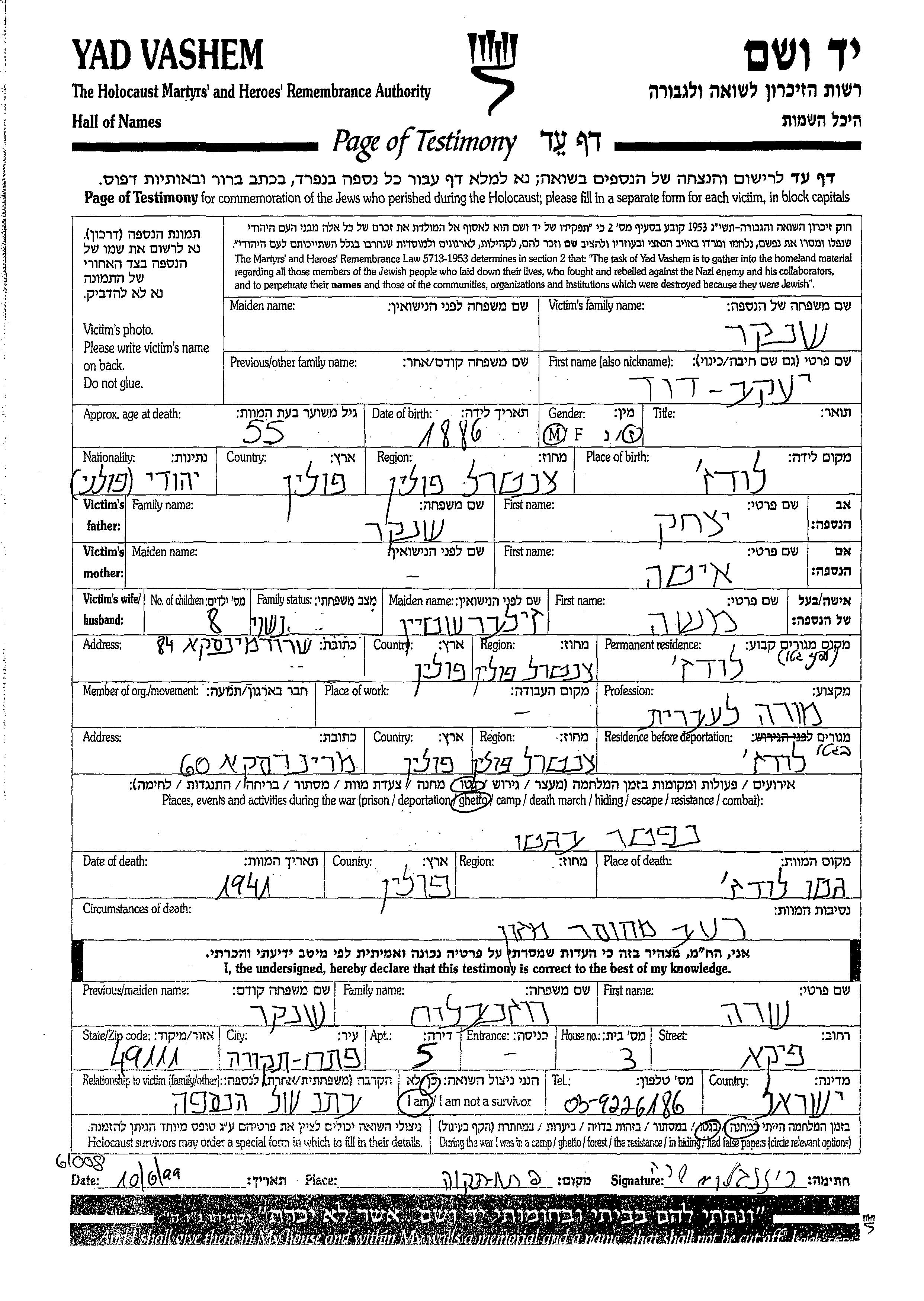 Yaakov Shenker wurde im Jahr 1886 in Lodz, Polen geboren. Er war der Sohn von Yitzkhak und Ita. Er war Hebräischlehrer/-in und mit Masha, geb. Zilbershtein Verheiratet. Vor dem Zweiten Weltkrieg lebte er in Lodz, Polen. Während des Krieges war er in Lodz, Polen.