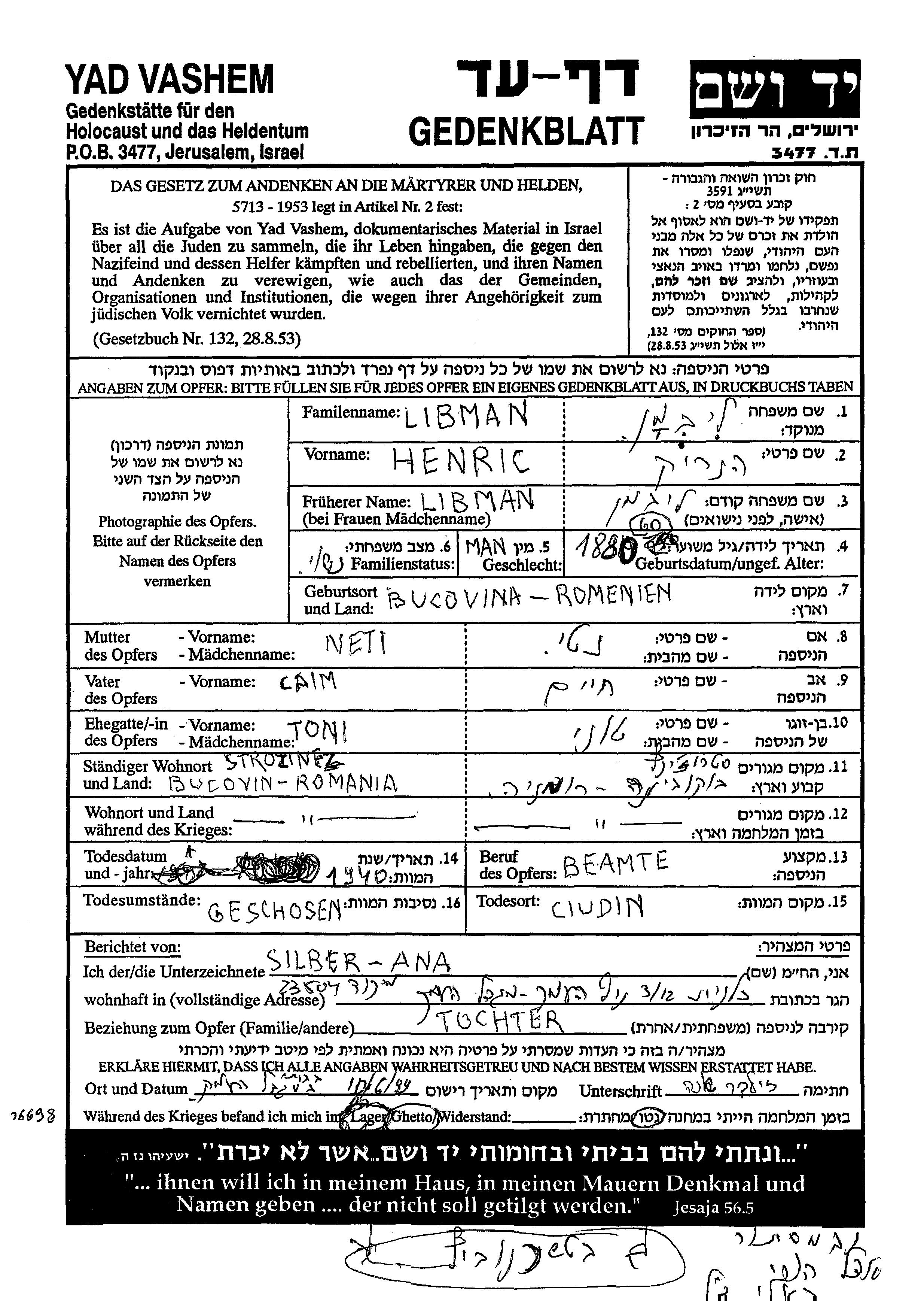 Henric Libman wurde im Jahr 1880 in Bukovina, Rumänien geboren. Er war der Sohn von Caim und Neti. Er war Angestellte/-r und mit Toni Verheiratet. Vor dem Zweiten Weltkrieg lebte er in Strozinetz, Rumänien. Während des Krieges war er in Strozinetz, Rumänien.