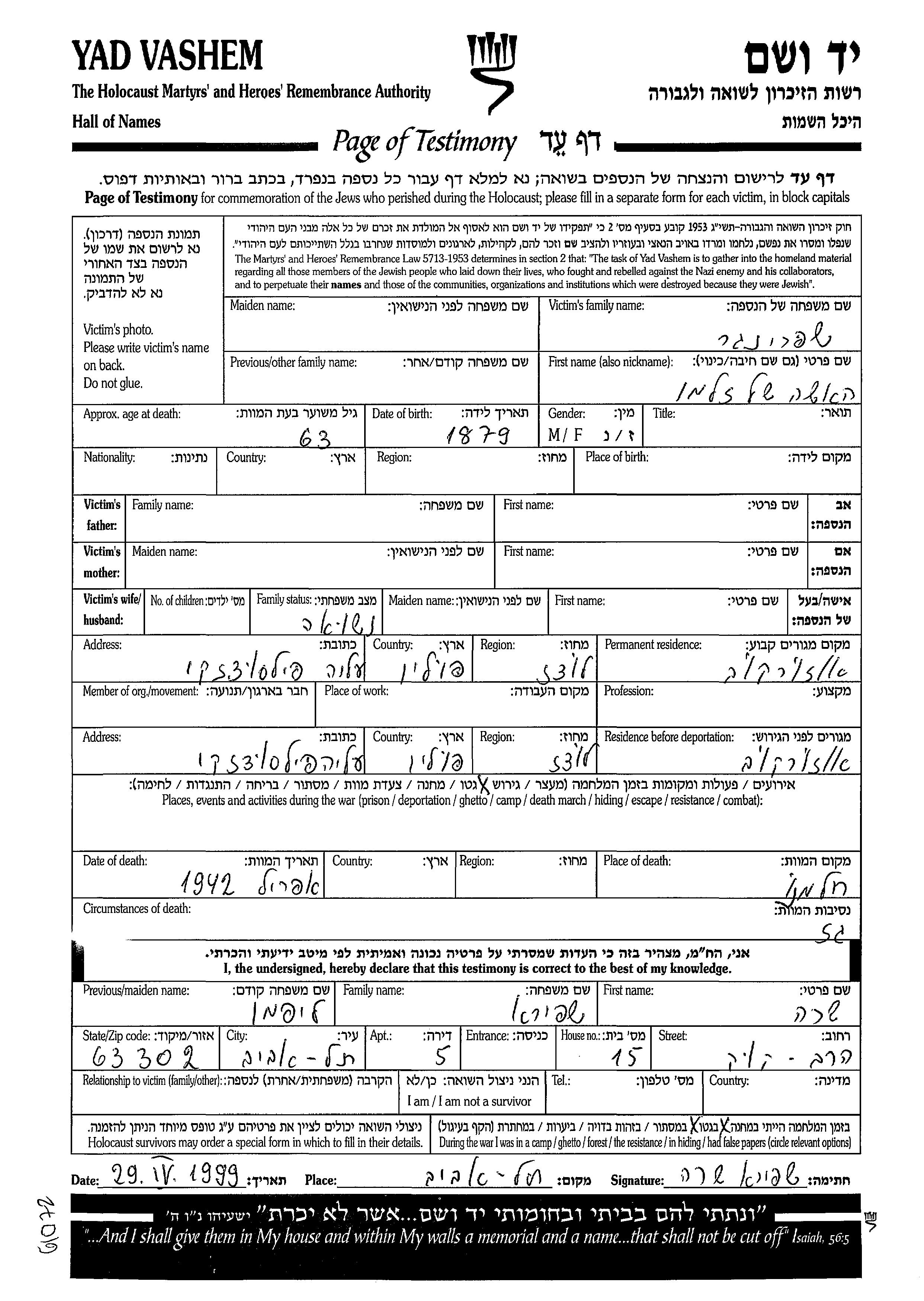 Vorname unbekannt Shpringer wurde im Jahr 1879 geboren. Sie war mit Zalman Verheiratet. Vor dem Zweiten Weltkrieg lebte sie in Ozorkow, Polen. Während des Krieges war sie in Ozorkow, Polen.