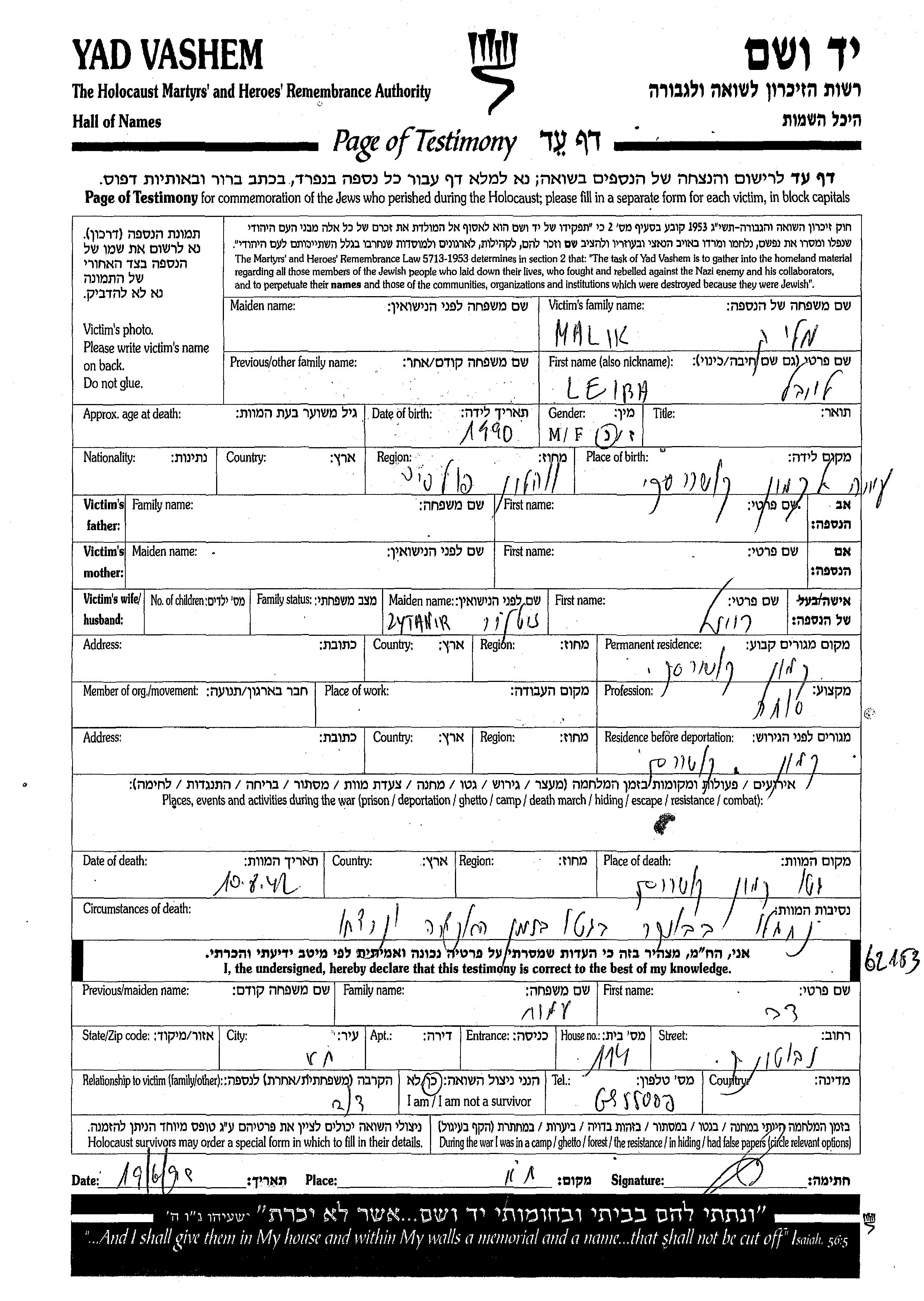 Leiba Malik wurde im Jahr 1890 in Kamien Koszyrski, Polen geboren. Er war Kaufmann/-frau und mit Reizl, geb. Zytanir Verheiratet. Vor dem Zweiten Weltkrieg lebte er in Kamien Koszyrski, Polen. Während des Krieges war er in Kamien Koszyrski, Polen.
