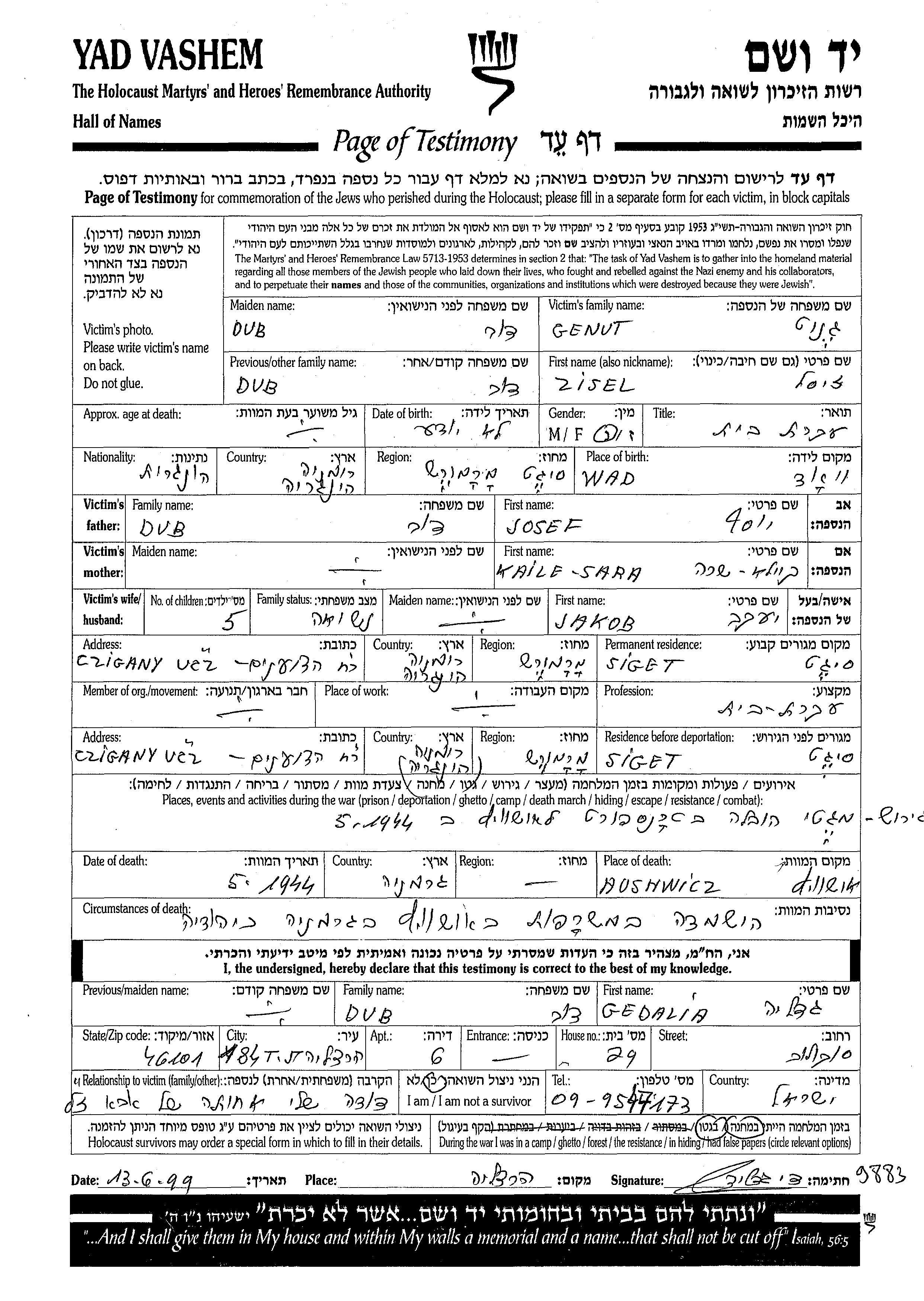 Zisel Zysl Genut, geb. Dov wurde in Vad, Rumänien geboren. Sie war die Tochter von Josef und Kaile Sara. Sie war Hausfrau und mit Jakob Verheiratet. Vor dem Zweiten Weltkrieg lebte sie in Siget, Rumänien. Während des Krieges war sie in Siget, Rumänien.