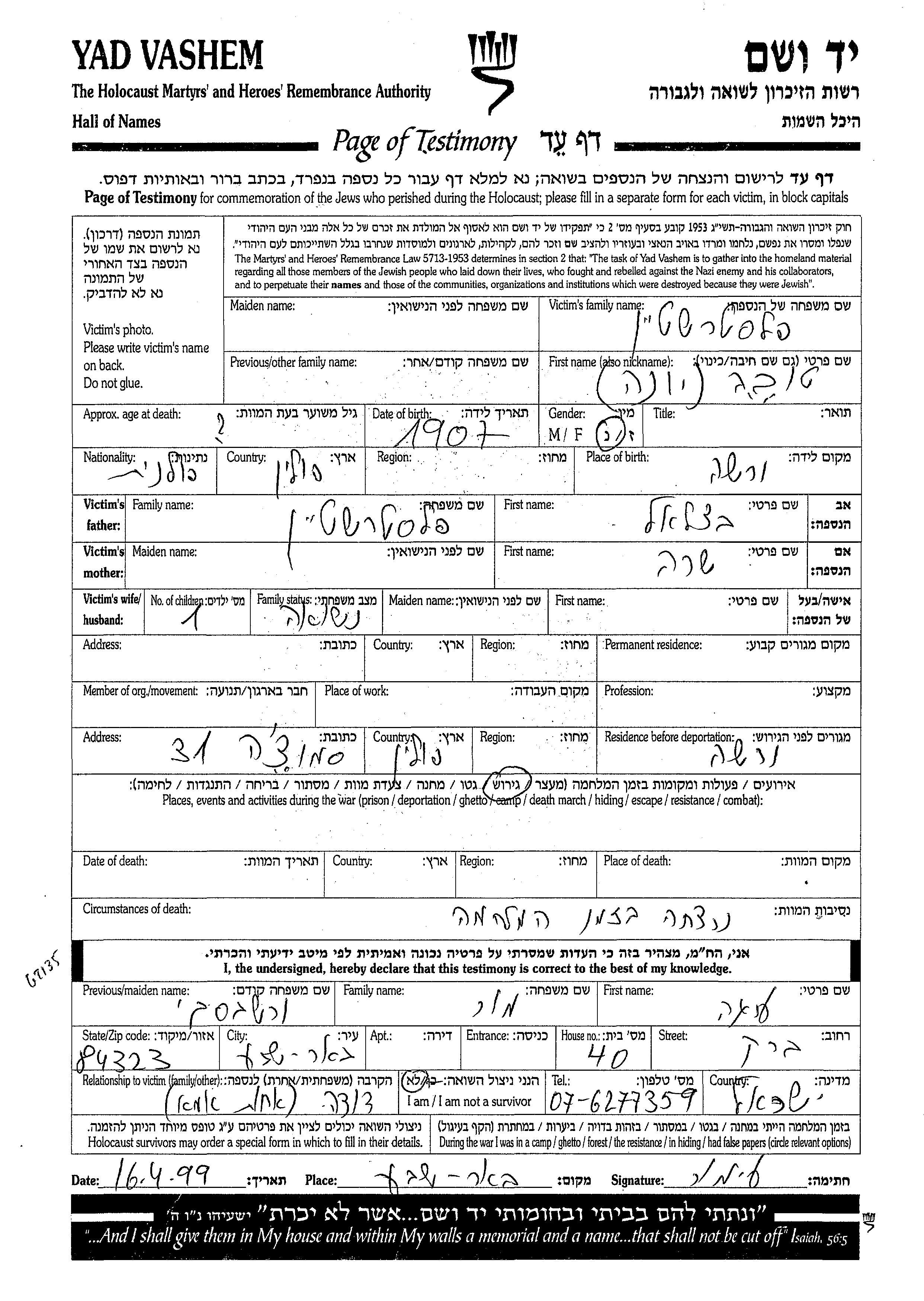 Tova Flastershtein wurde im Jahr 1907 in Varsha, Polen geboren. Sie war die Tochter von Betzalel und Sara. Sie war Verheiratet. Während des Krieges war sie in Varsha, Polen.