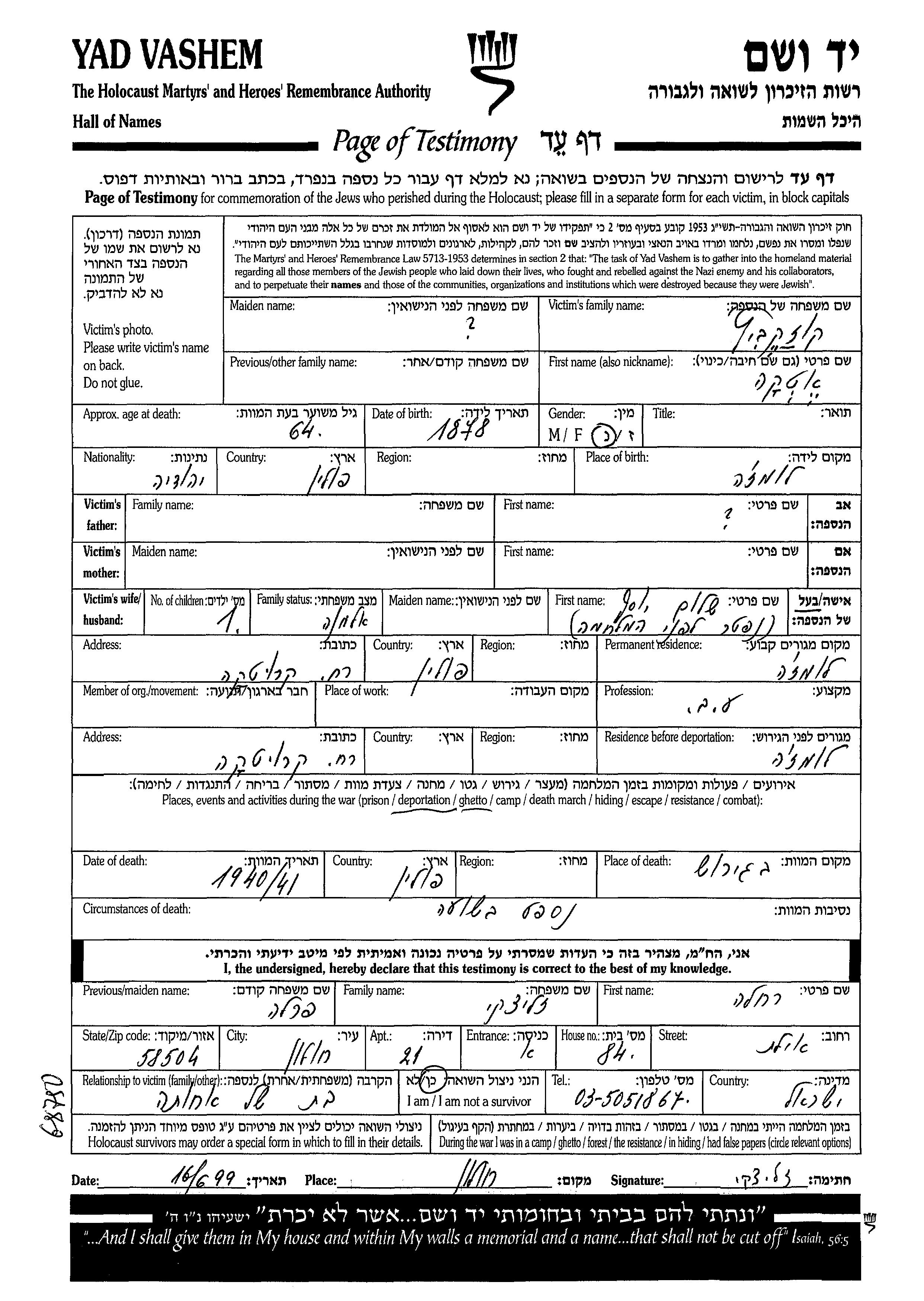 Etka Kozakevitz wurde im Jahr 1878 in Łomża, Polen geboren. Sie war Hausfrau und mit Shalom Yosef Witwe. Vor dem Zweiten Weltkrieg lebte sie in Łomża, Polen. Während des Krieges war sie in Łomża, Polen.