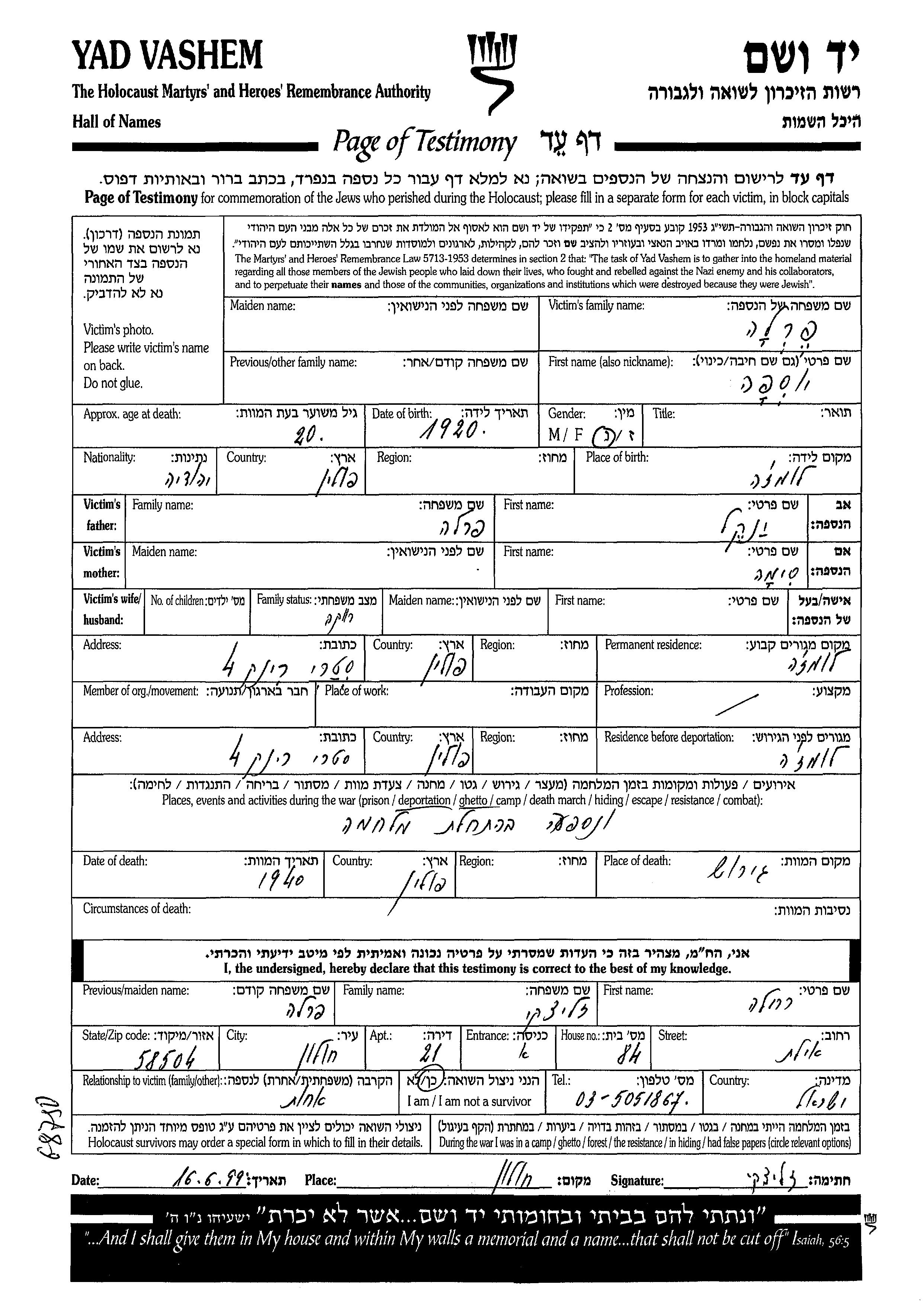 Yosefa wurde in der Schoah ermordet. Todesort: Polen im Jahr 1940.
