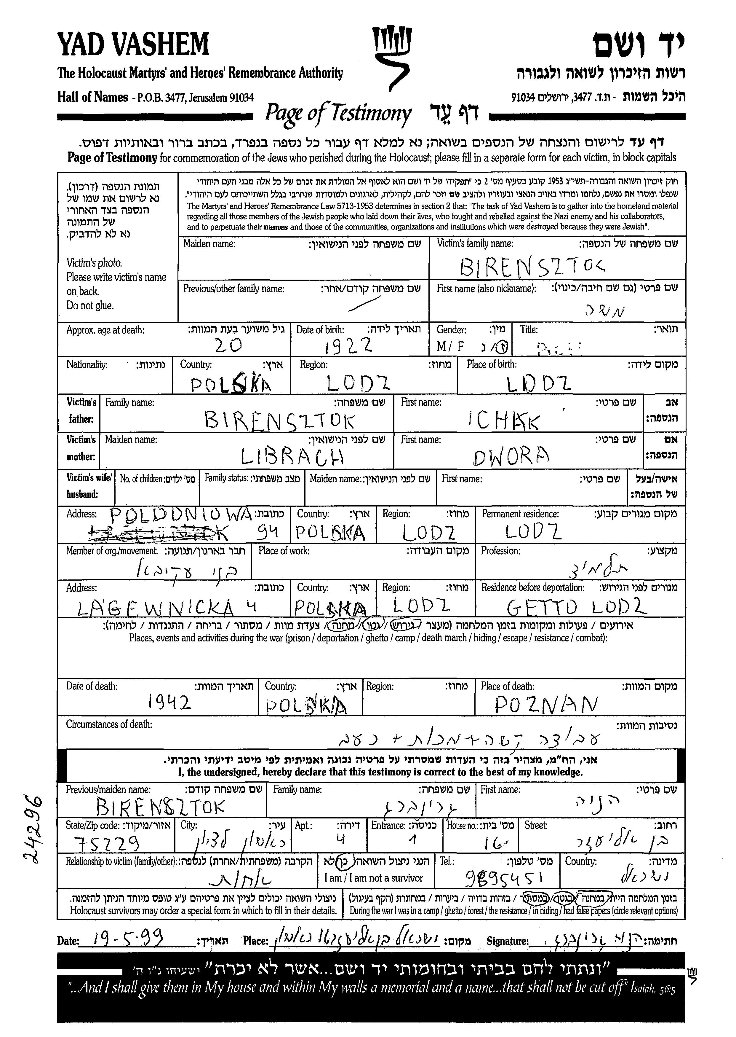 Birensztok Moshe 1922 Lodz, Polen Gedenkblatt