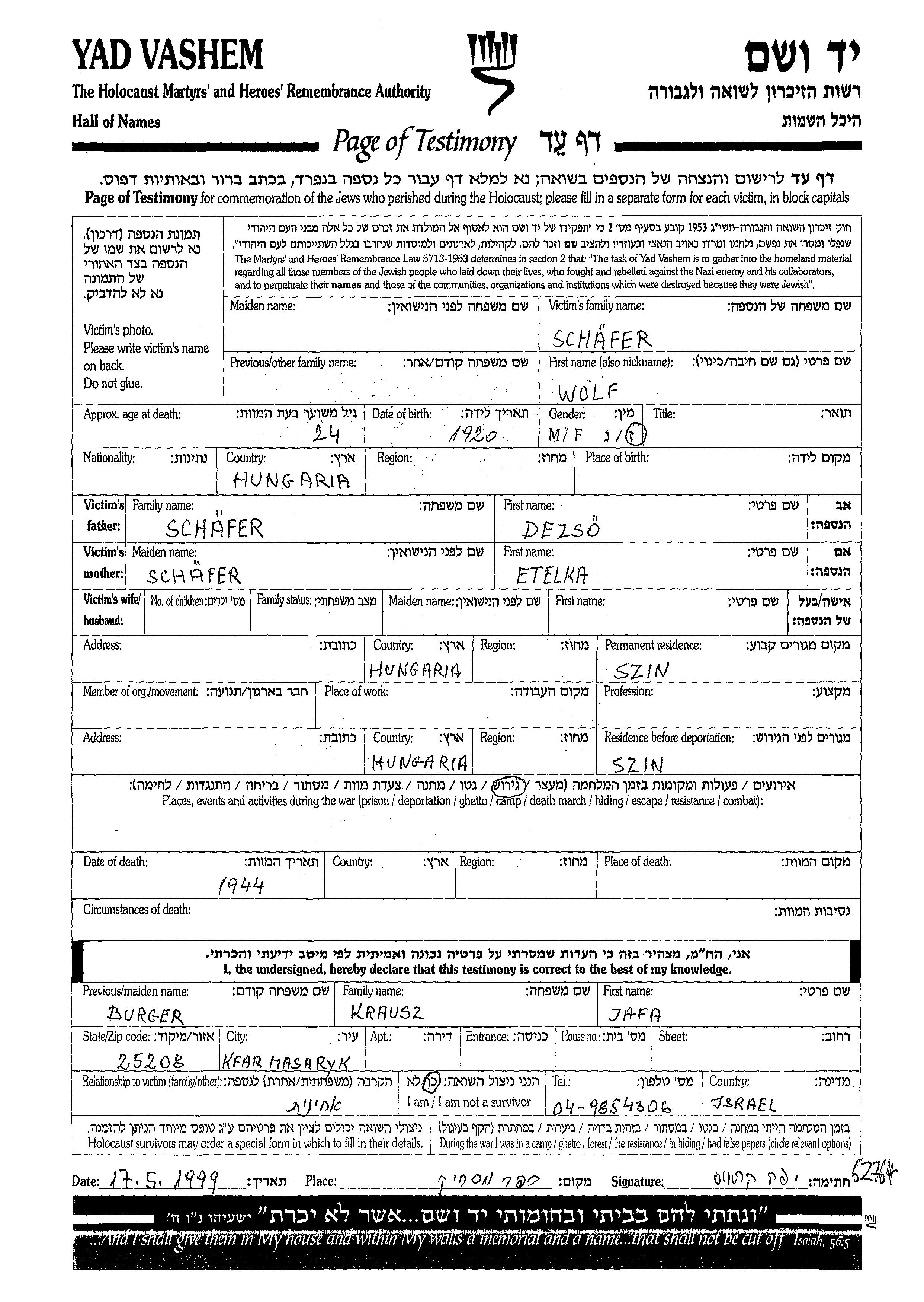 Wolf Schafer wurde im Jahr 1920 in Ungarn geboren. Er war der Sohn von Dezso und Etelka. Vor dem Zweiten Weltkrieg lebte er in Szin, Ungarn. Während des Krieges war er in Szin, Ungarn.