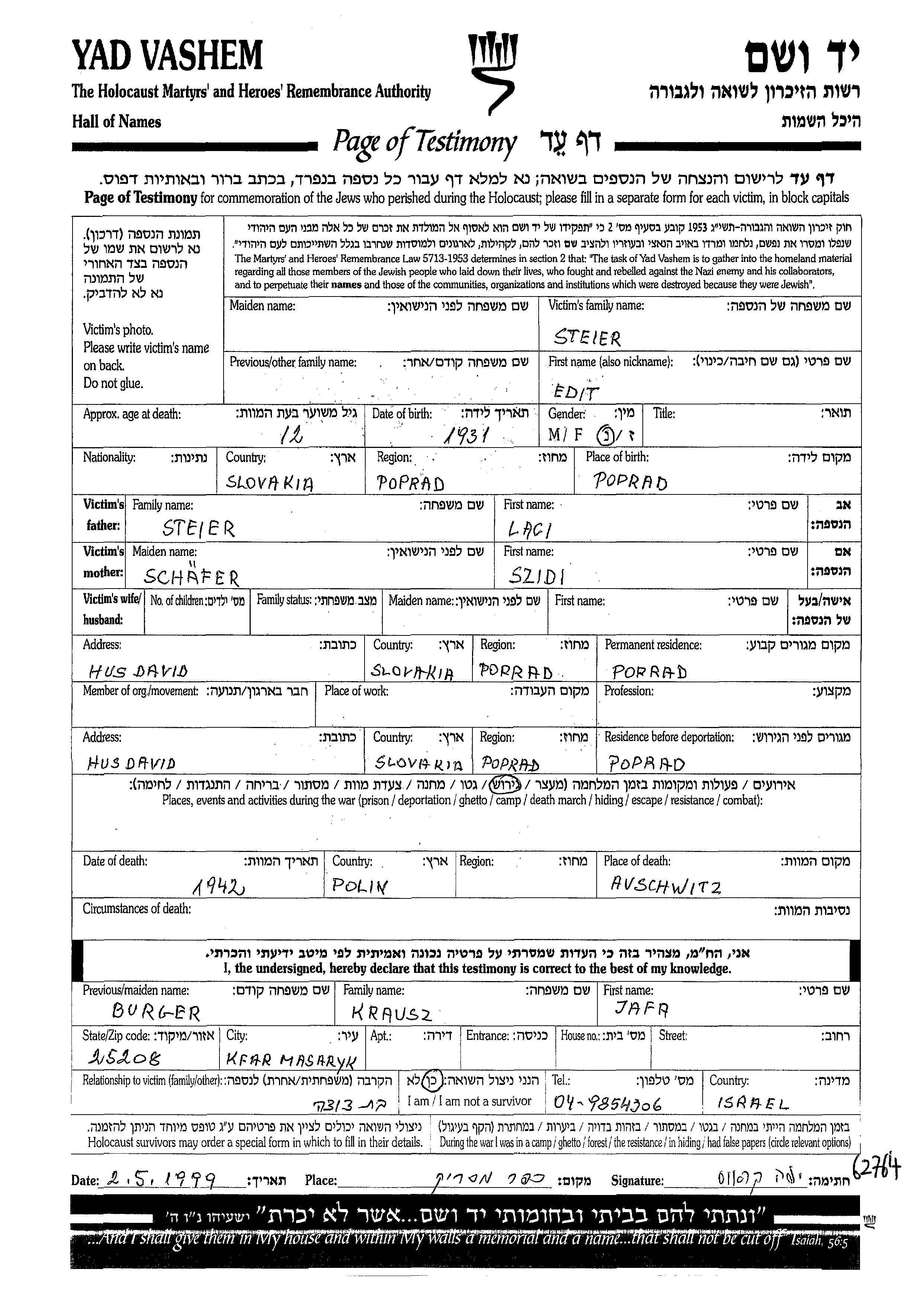 Edit wurde in der Schoah ermordet. Todesort: Auschwitz, Polen im Jahr 1942.