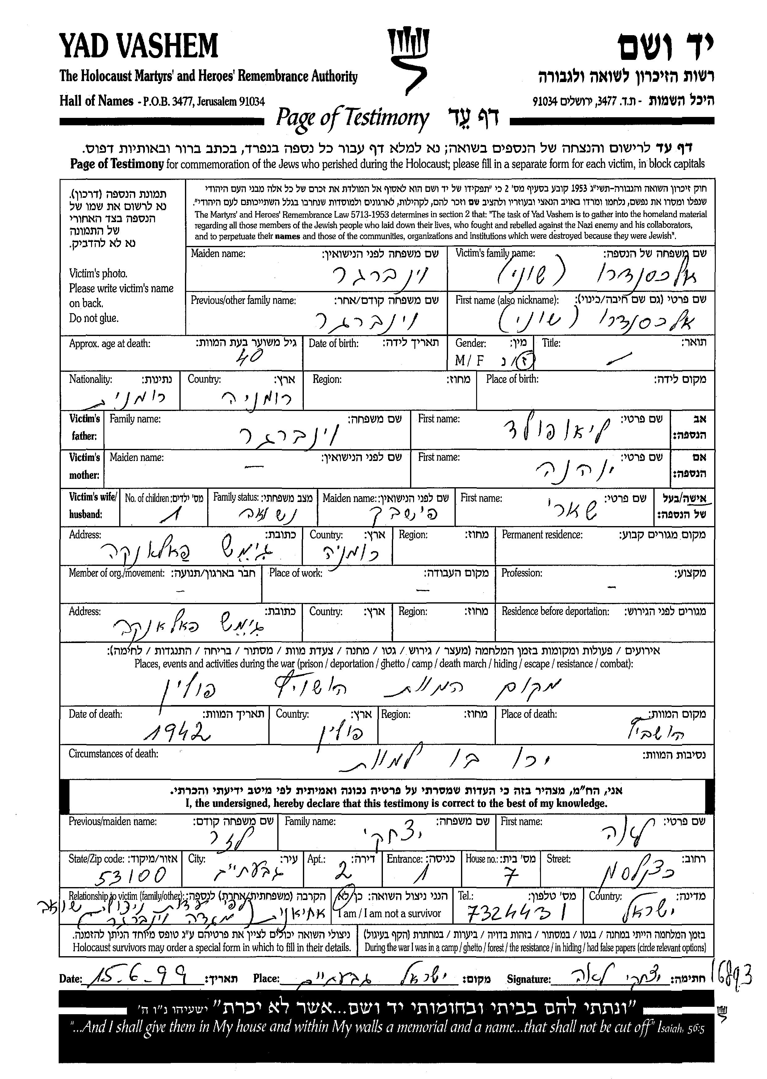 Aleksander Veinberger wurde in Rumänien geboren. Er war der Sohn von Liopold und Yohana. Er war mit Sari, geb. Fishbakh Verheiratet. Vor dem Zweiten Weltkrieg lebte er in Gimes, Rumänien. Während des Krieges war er in Gimes, Rumänien.
